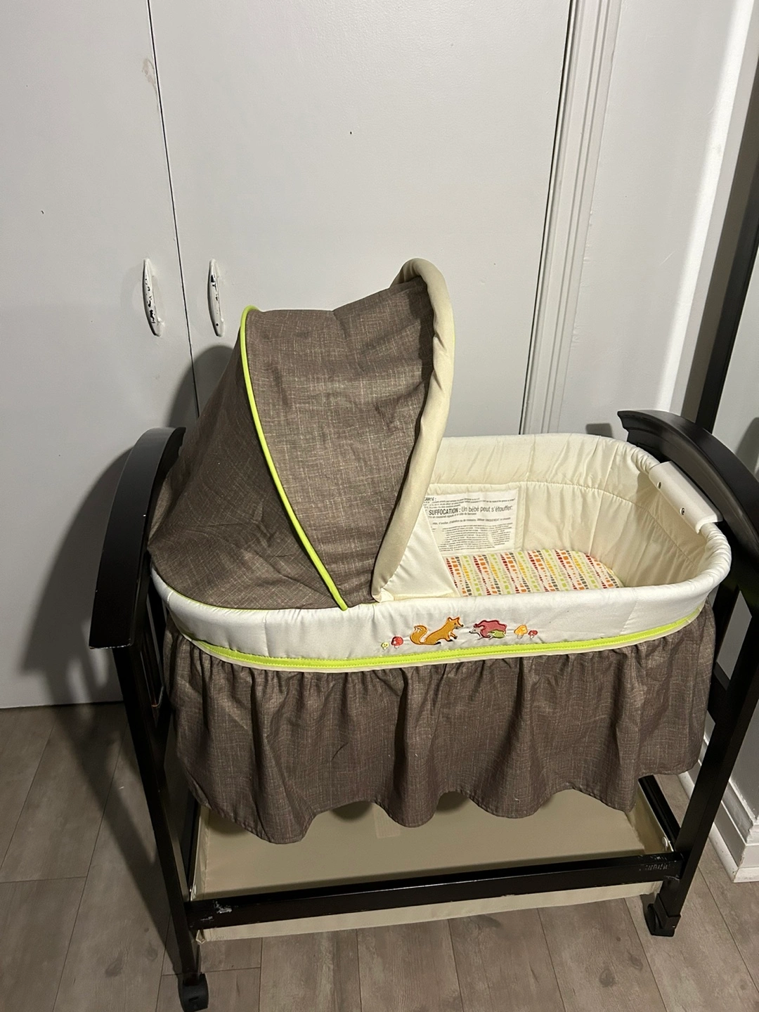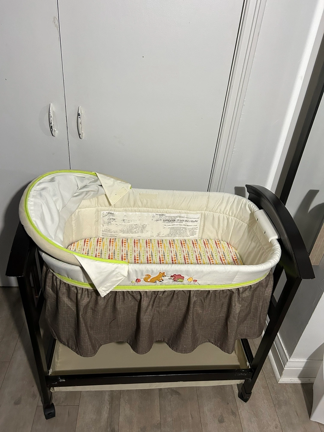 Dark brown wooden bassinet with stand. Includes a padded mattress and fitted sheet. Features a canopy and storage shelf. Adorable woodland creature embroidery.
