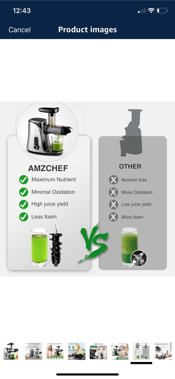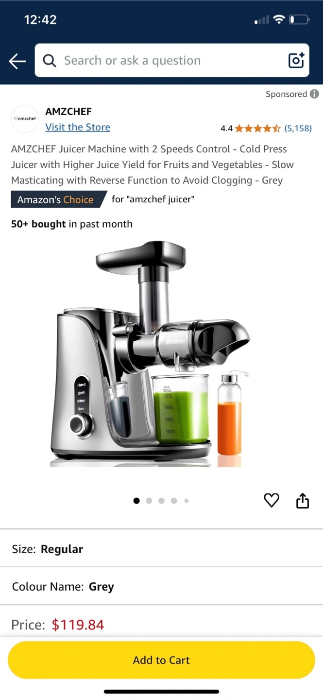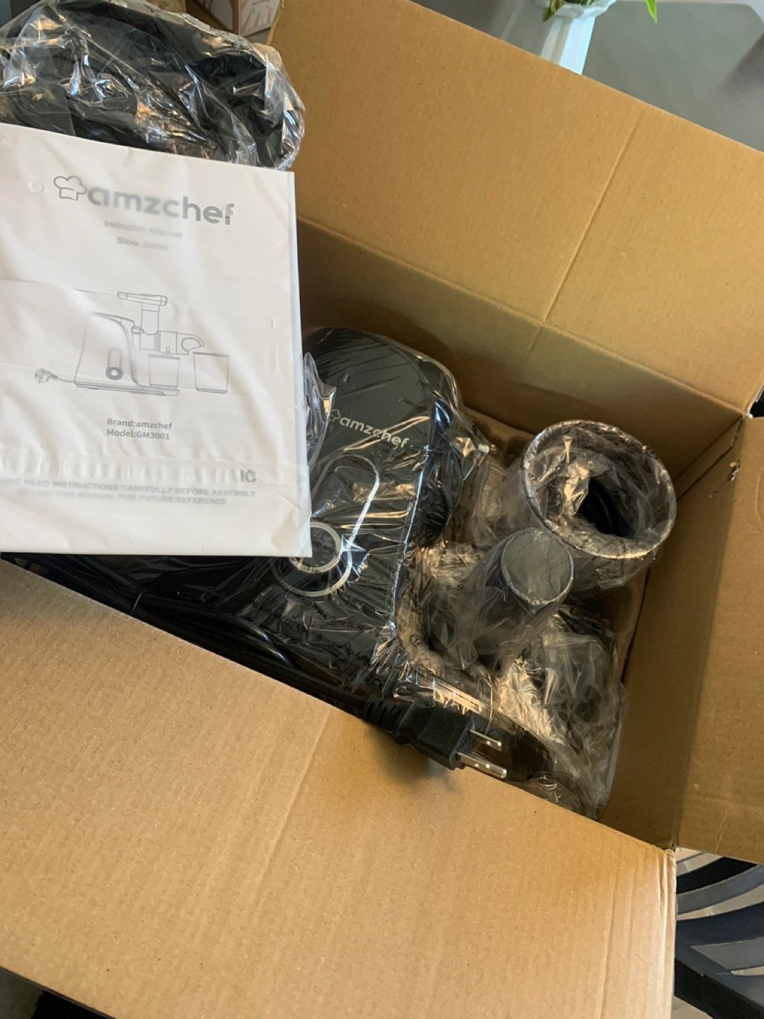 Brand new in box This juicer is Black not grey as in photo. AMZCHEF juicer. Two speeds. Cold press juicer for fruits and vegetables. Slow masticating with reverse function. Avoids clogging. Includes juice cup. Easy to disassemble. Quiet operation. Smart LED control panel.
