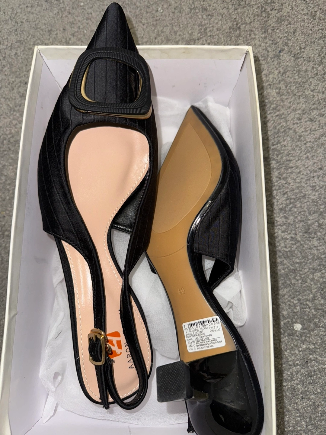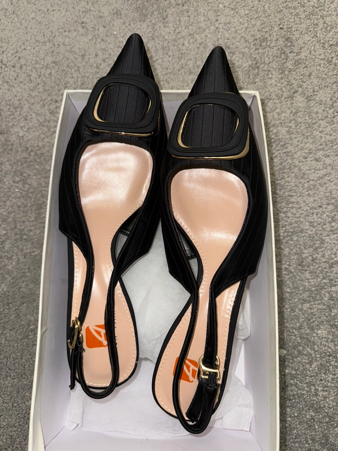 261Elegant black slingback heels. Size 39 US 8.5 can wear Features a pointed toe and gold accent. Low heel. New with box.