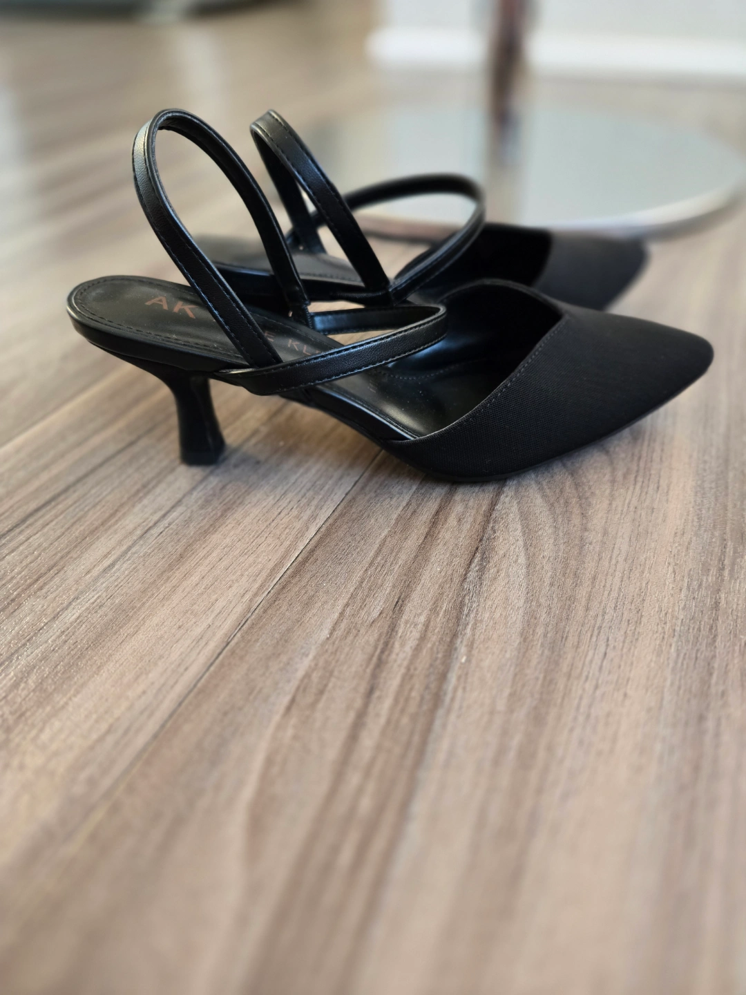 Elegant black slingback heels, worn once for a wedding. Pointed-toe design. Low kitten heel. Simple and sophisticated style. Perfect for work or a night out.