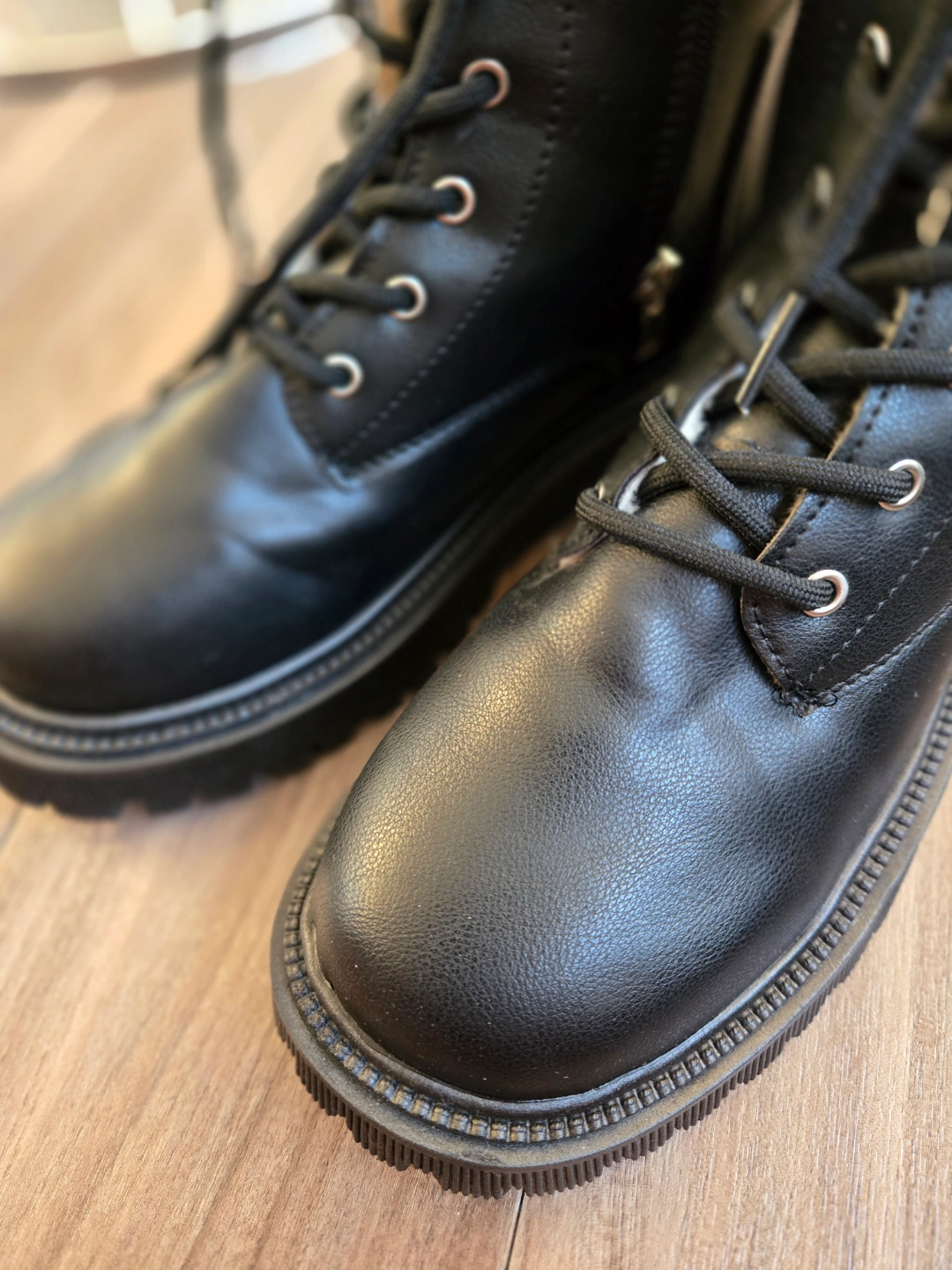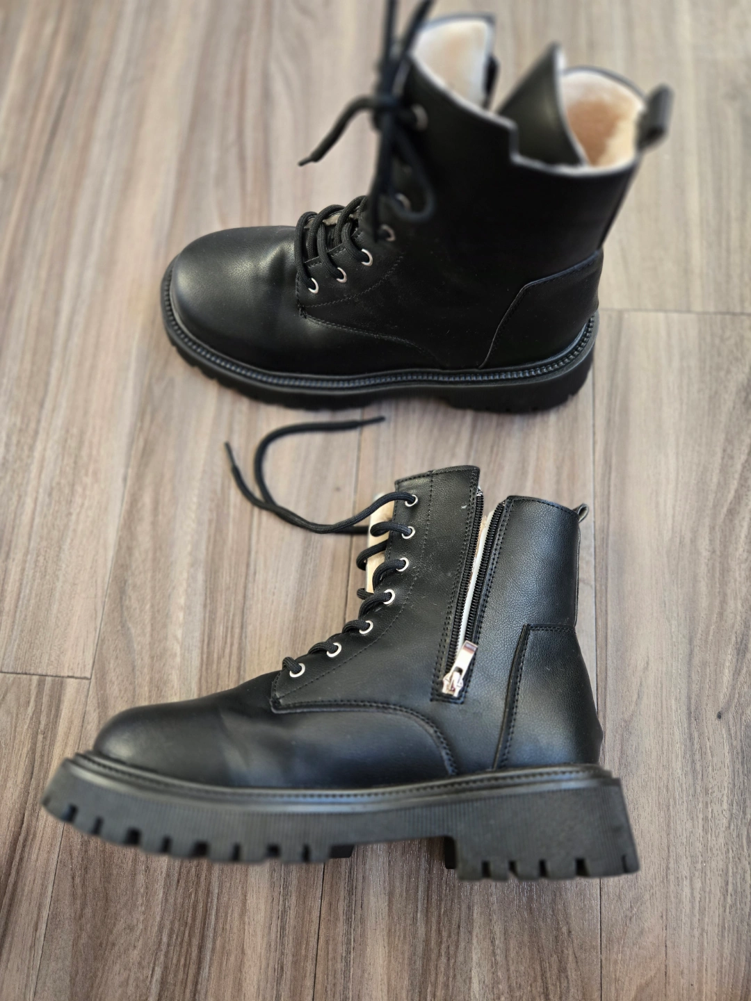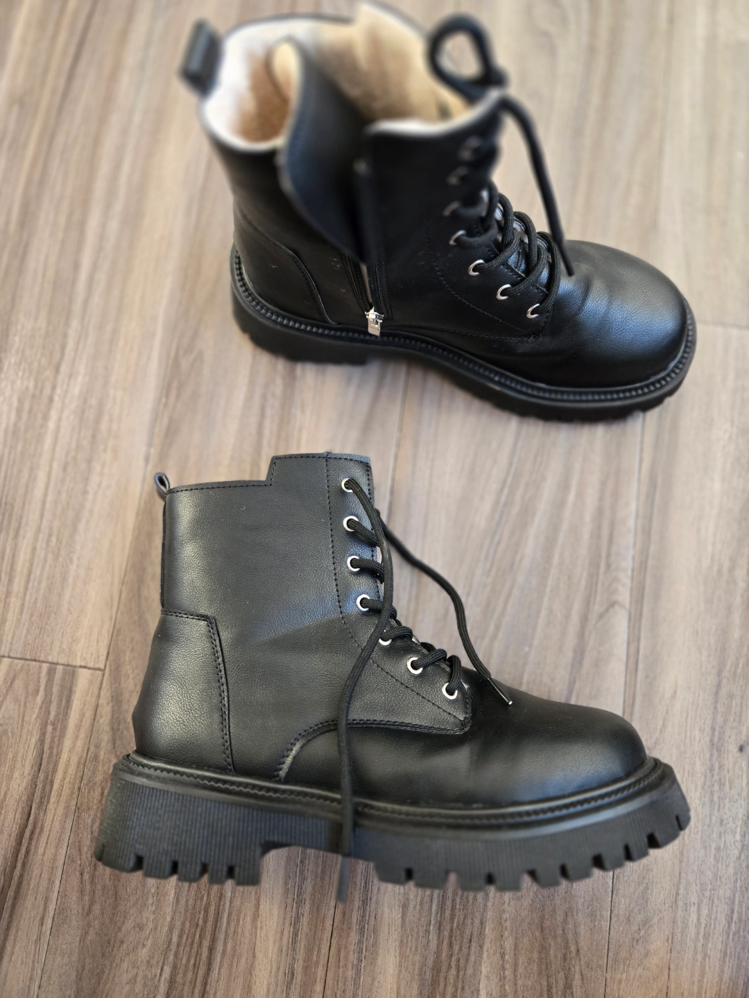 Pair of black faux leather ankle boots. Worn once. Lace-up closure and side zip. Chunky platform sole. Faux fur lining. Great for fall and winter. The reason for sale - the boots are small for me, my usual size is 9.