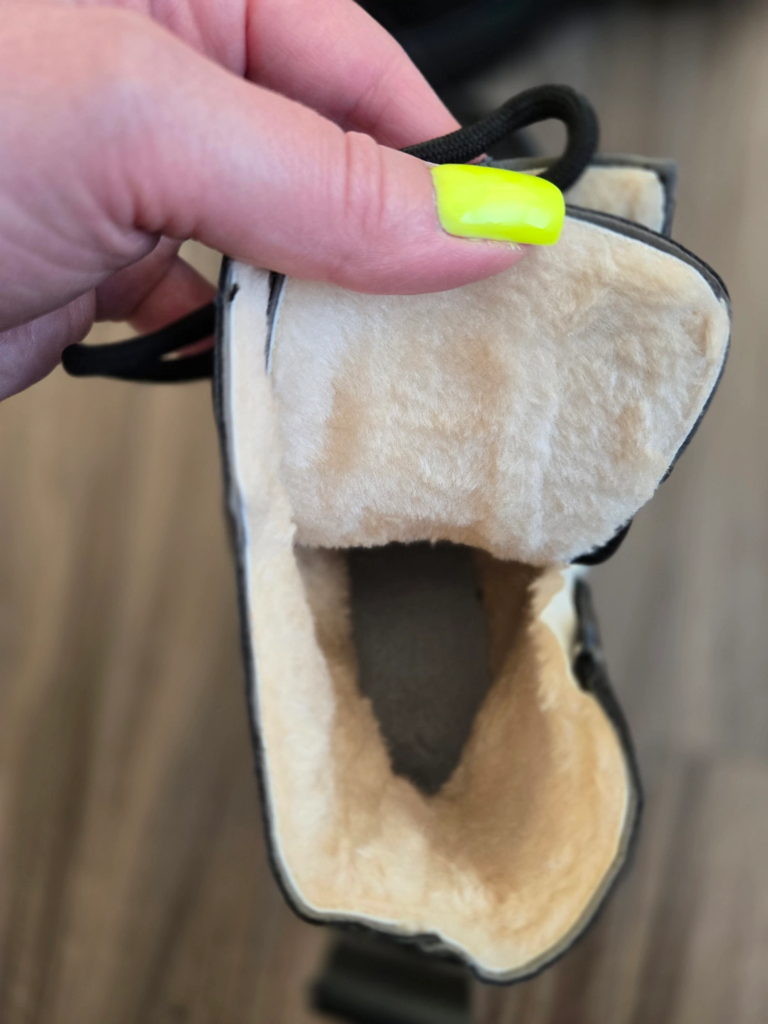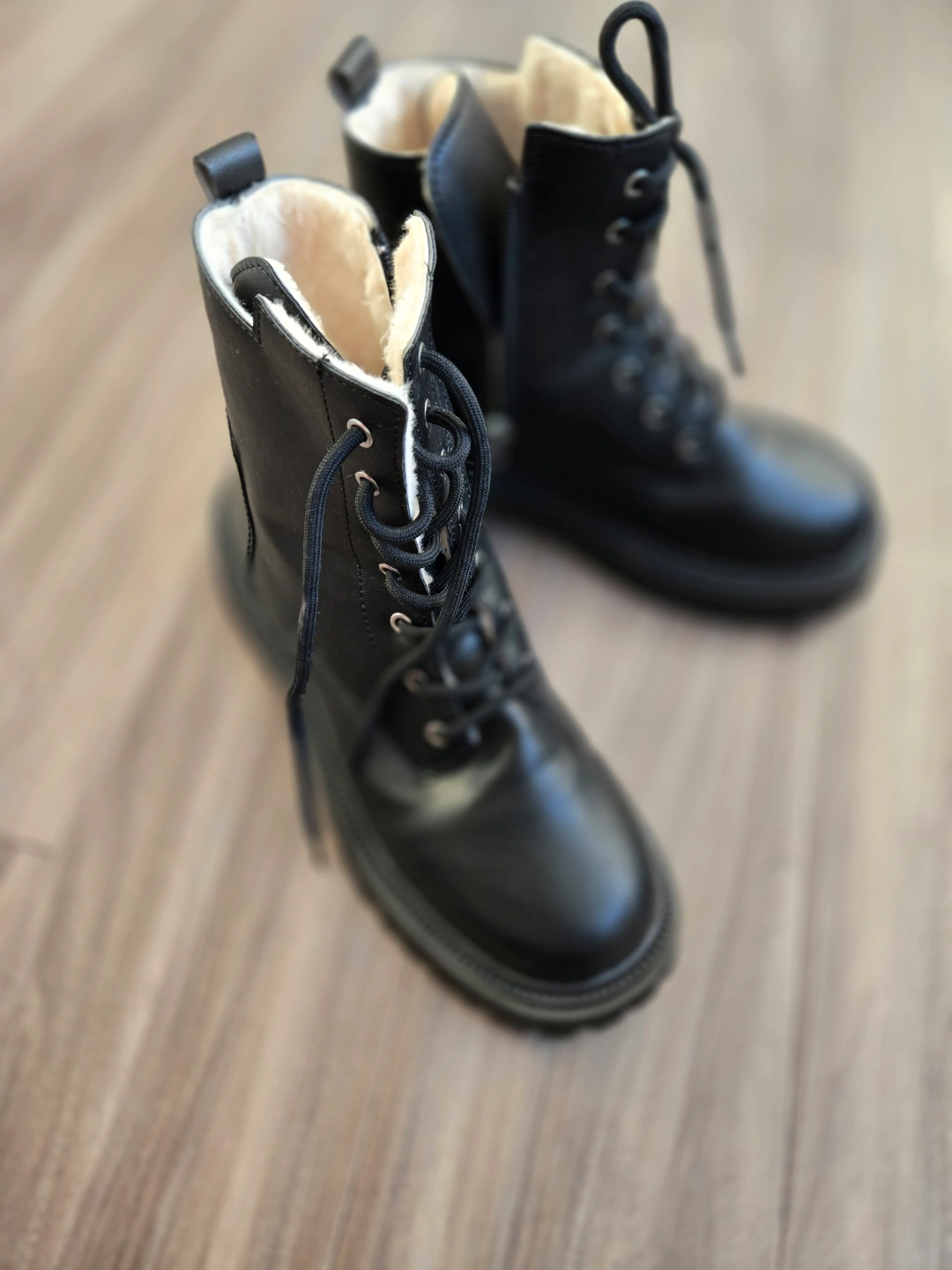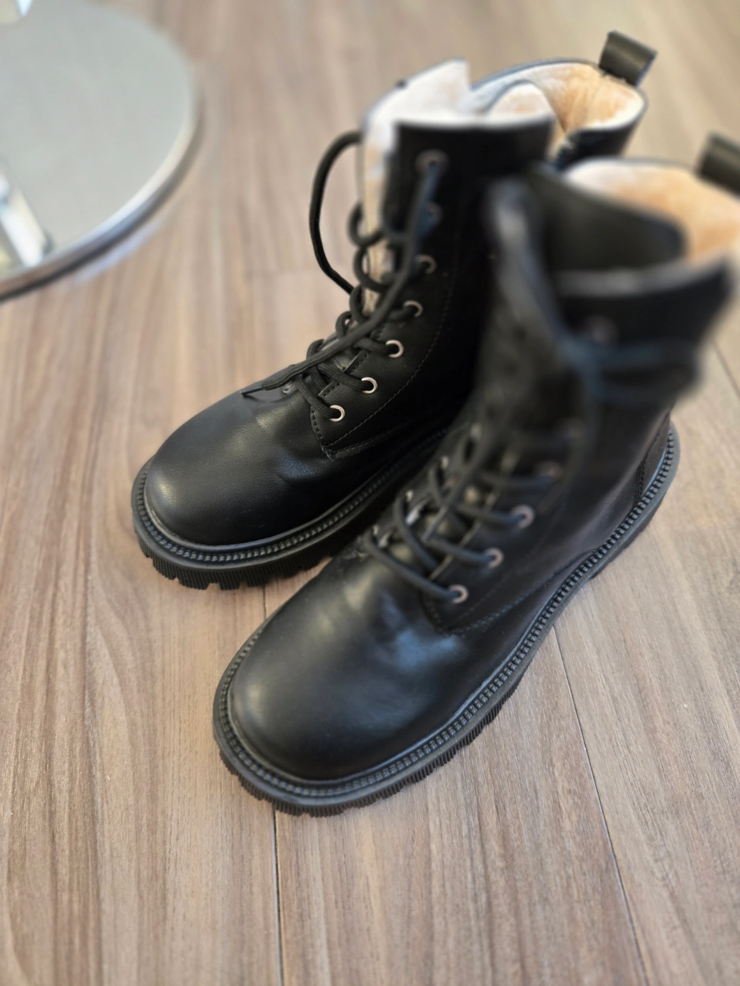 Pair of black faux leather ankle boots. Worn once. Lace-up closure and side zip. Chunky platform sole. Faux fur lining. Great for fall and winter. The reason for sale - the boots are small for me, my usual size is 9.