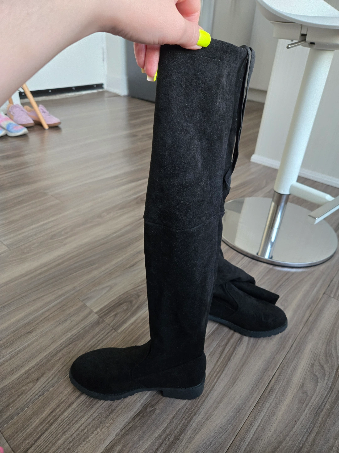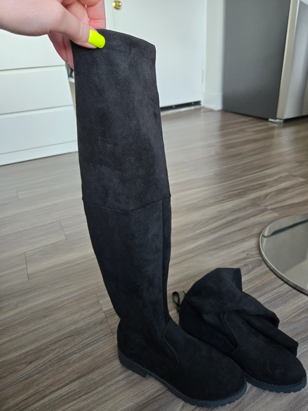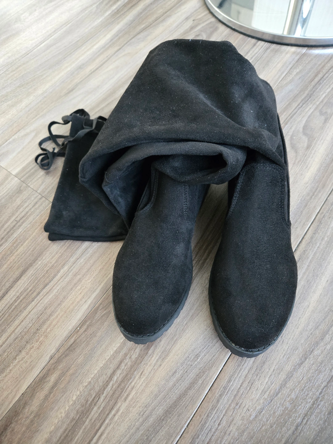 Pair of black suede over-the-knee boots. Never worn. Flat heel. Pull-on style with laces at the back. Good for fall. The reason for sale - the boots are small for me.