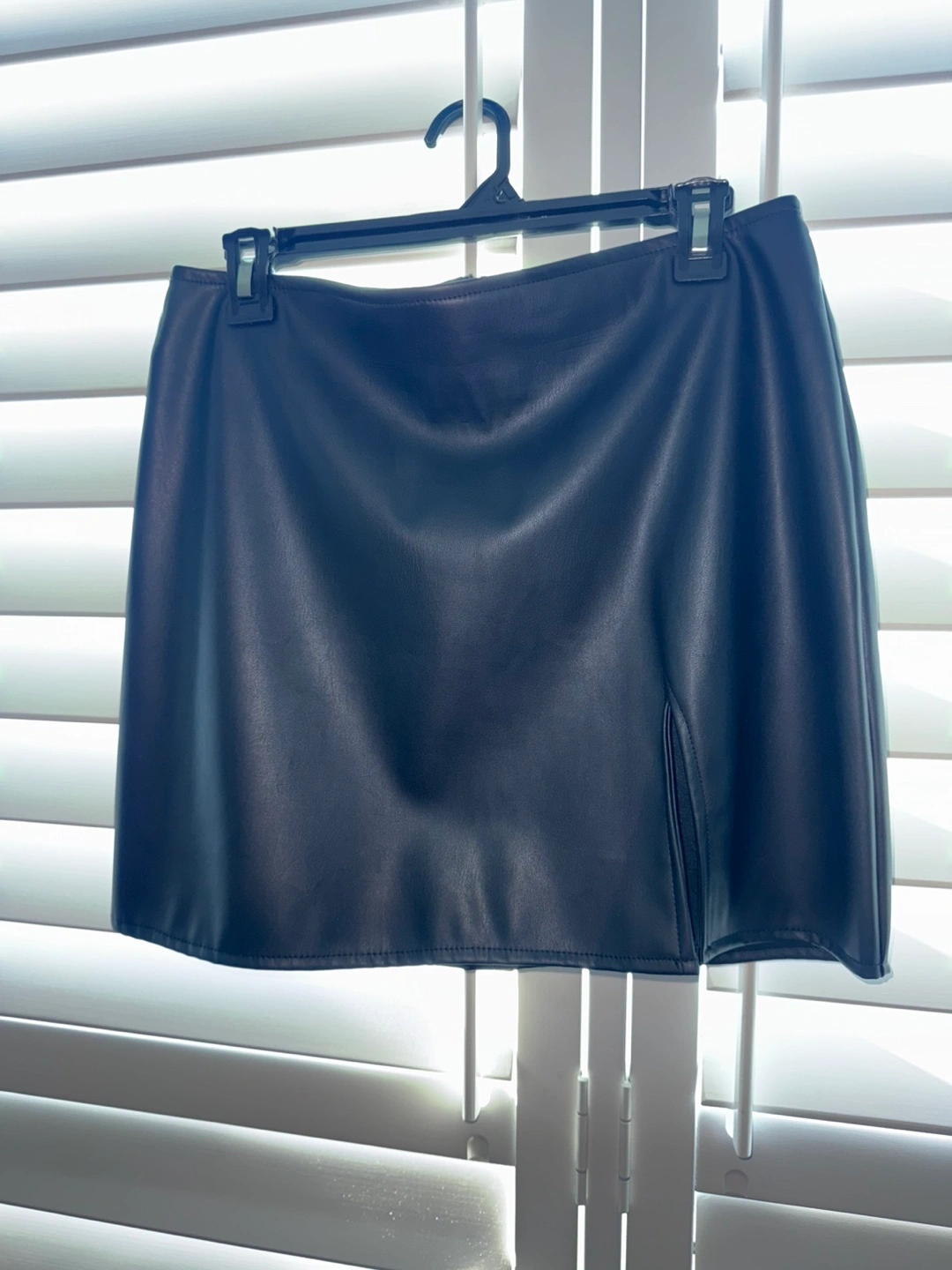 Black faux leather mini skirt. Side slit. Great for a night out or casual wear. Excellent condition.