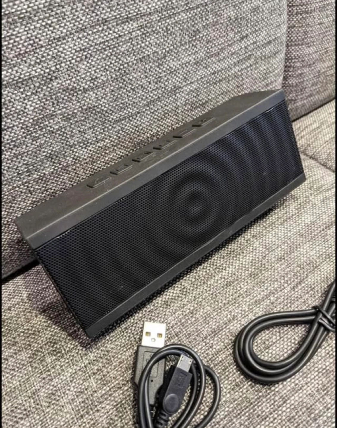 Portable Bluetooth speaker. Black with red accents. Includes charging cable and aux cable. Excellent sound quality. Compact and lightweight. Perfect for travel or home use.