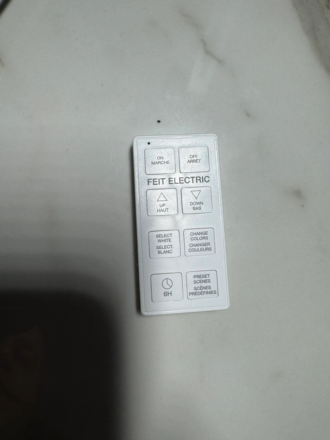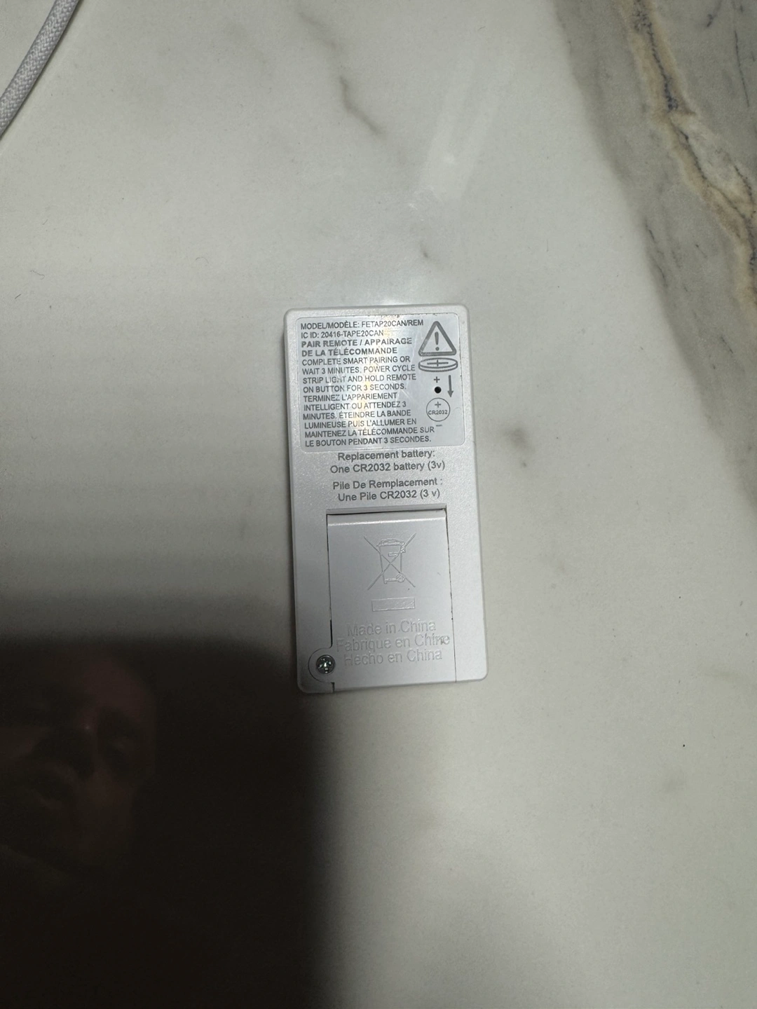Remote control for smart LED lights. Includes on/off, brightness, colour changing, and preset scene functions. Requires one CR2032 battery.