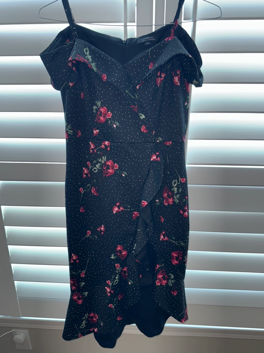 Beautiful black, floral print midi dress. Off-the-shoulder style with ruffles. Fitted silhouette. High quality material.