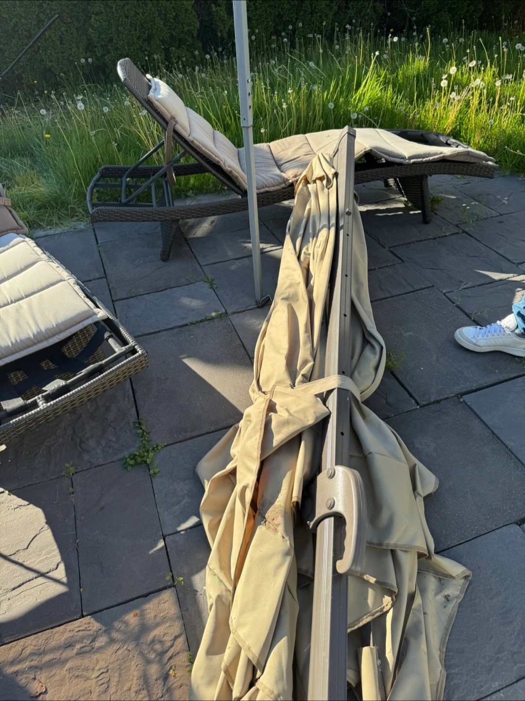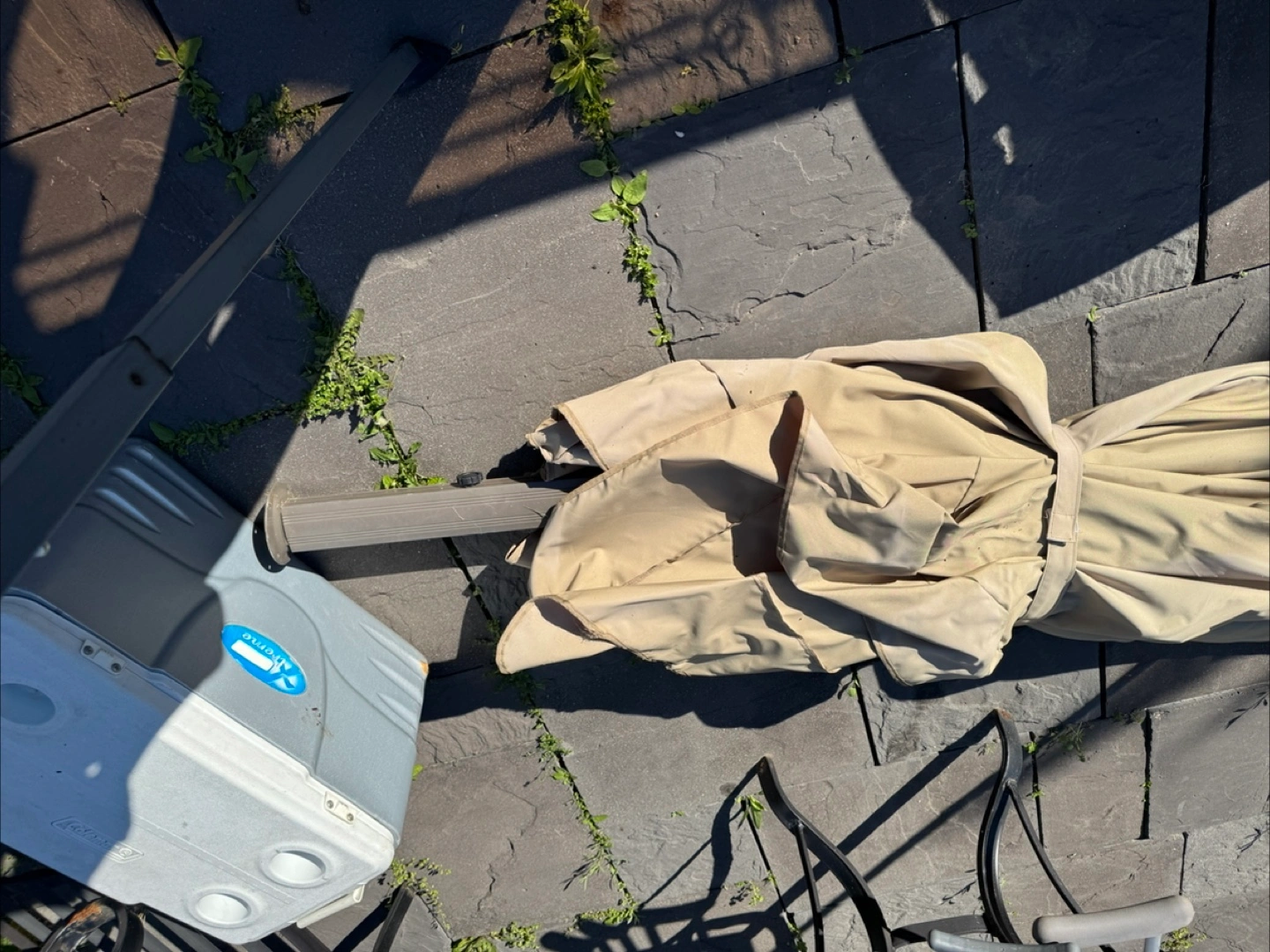 11Beige patio umbrella, cantilever style. Stored and shown folded. It needs a bottom part that holds it. You can order it on Amazon. The cost of this umbrella is over 500.