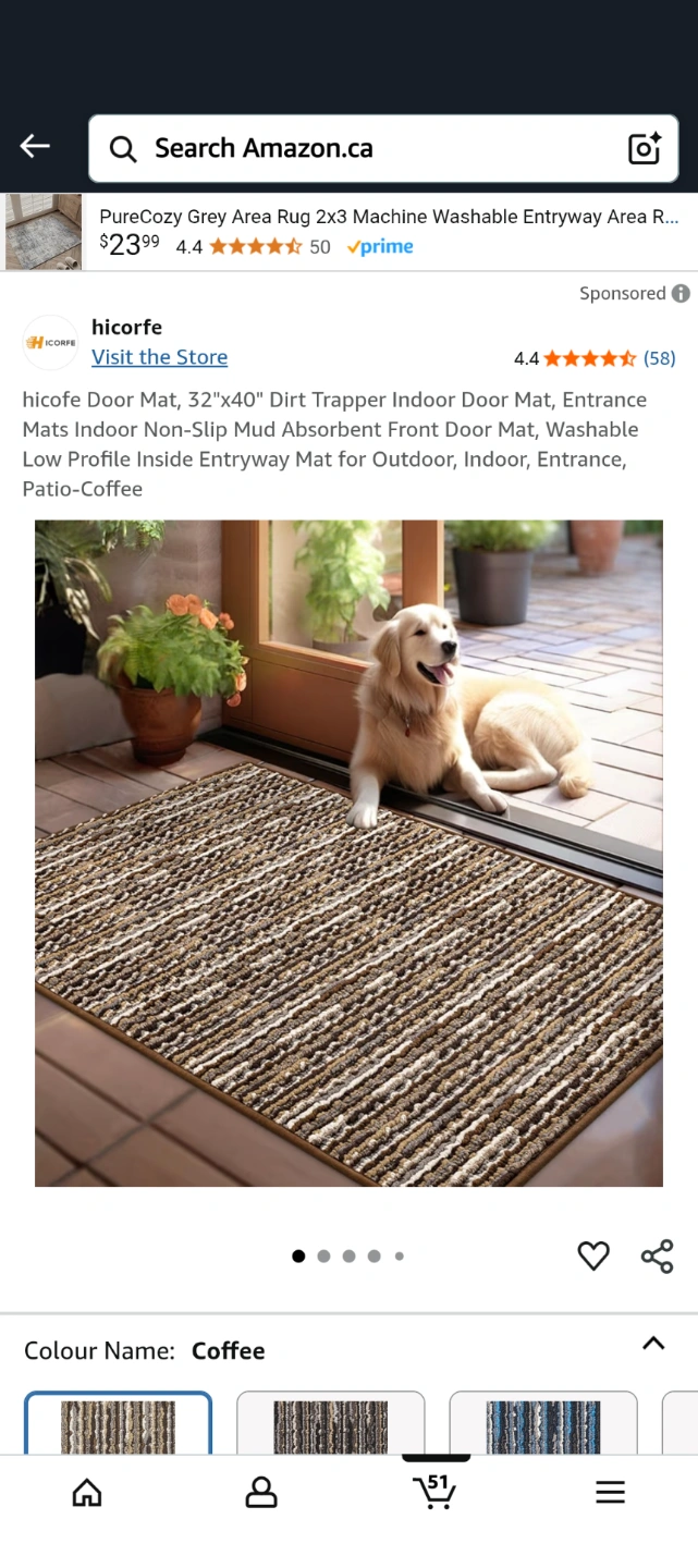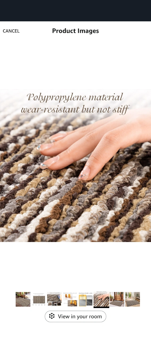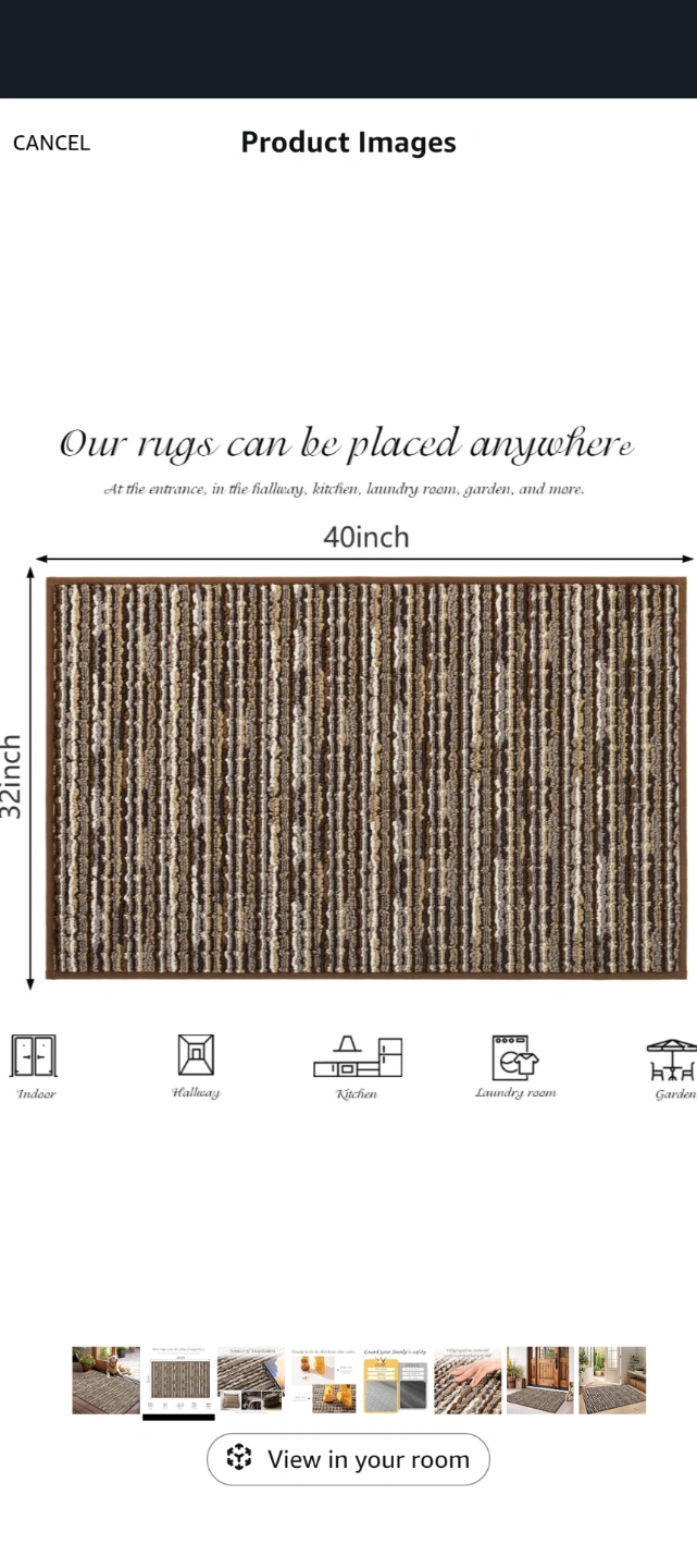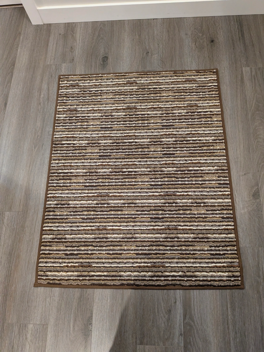 Wear-resistant polypropylene doormat. Brown and beige striped design. Approximately 32" x 40". Suitable for indoor and outdoor use. Machine washable.