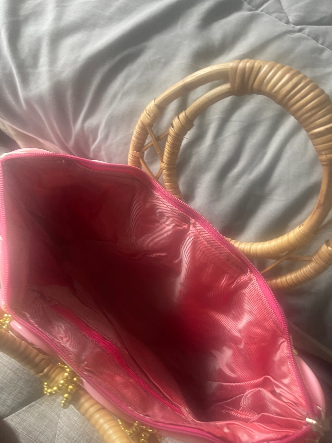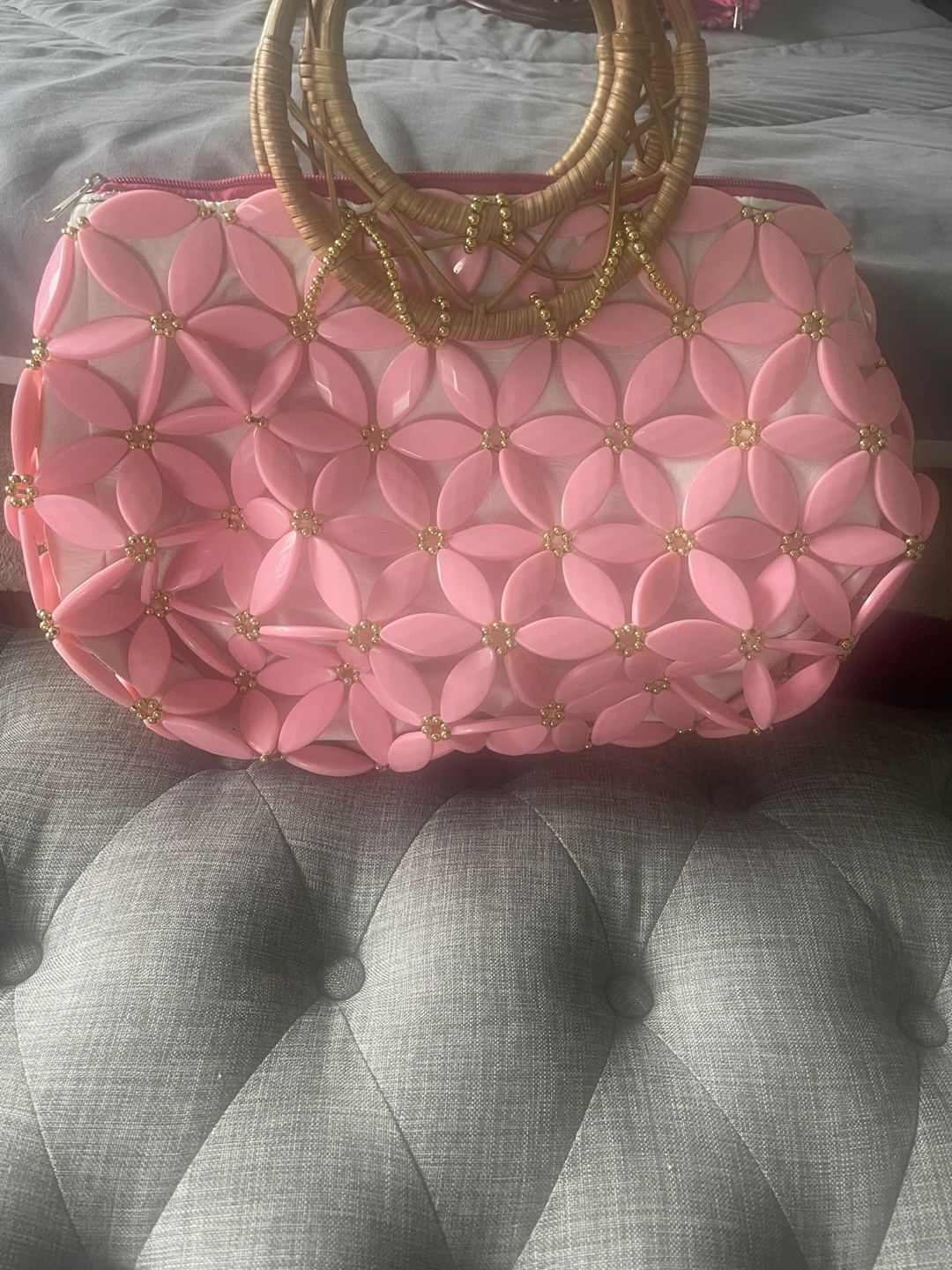 Unique handbag. Pink beaded exterior. Bamboo top handles. Pink lining. Zipper closure. Great for summer.
