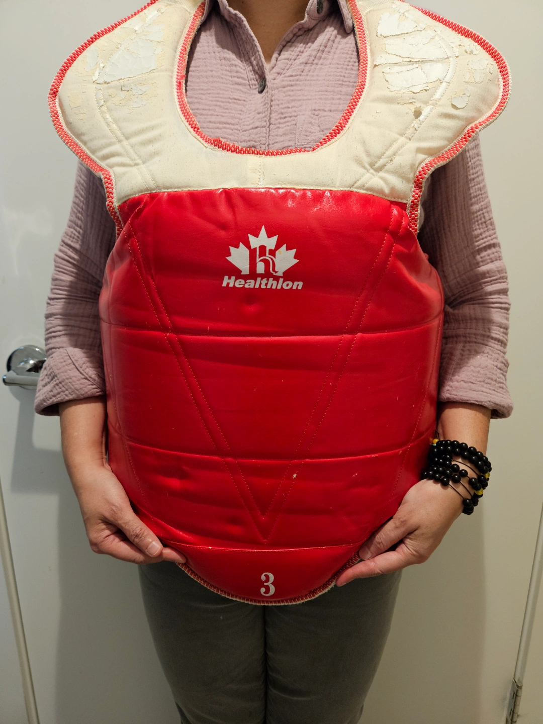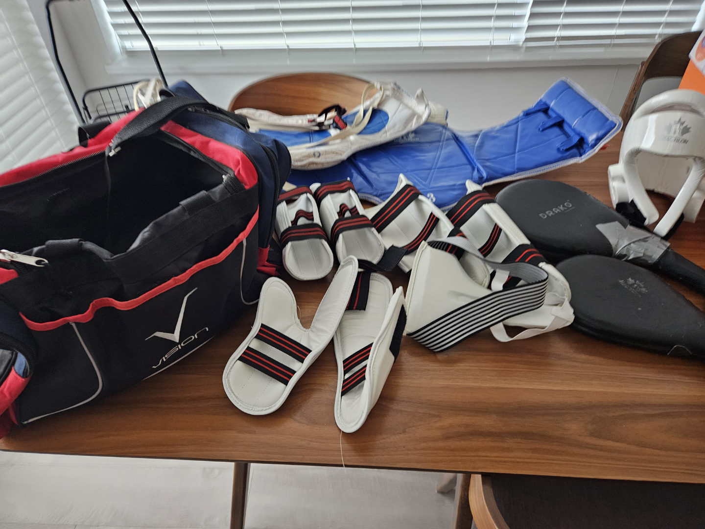 Large sports bag(1), ideal for martial arts. Includes body protectors(2), forearm guards(pair), hand pads(pair), headgear(1), shin guard (pair) and groin protector(1). A couple items show wear from use but has lots of life in it. Also, including 2 targets for kicking & punching. Great starter kit or practice gear.