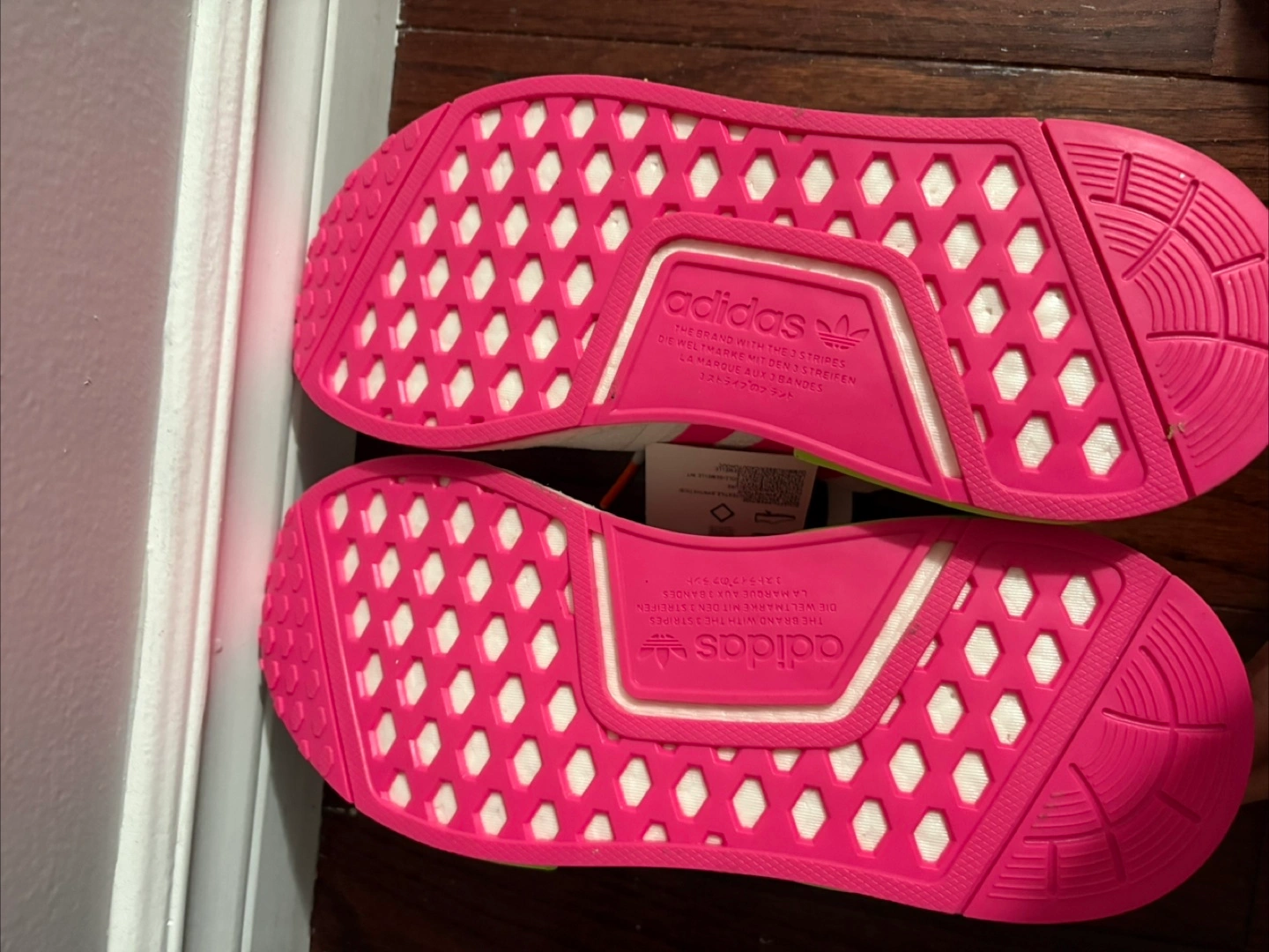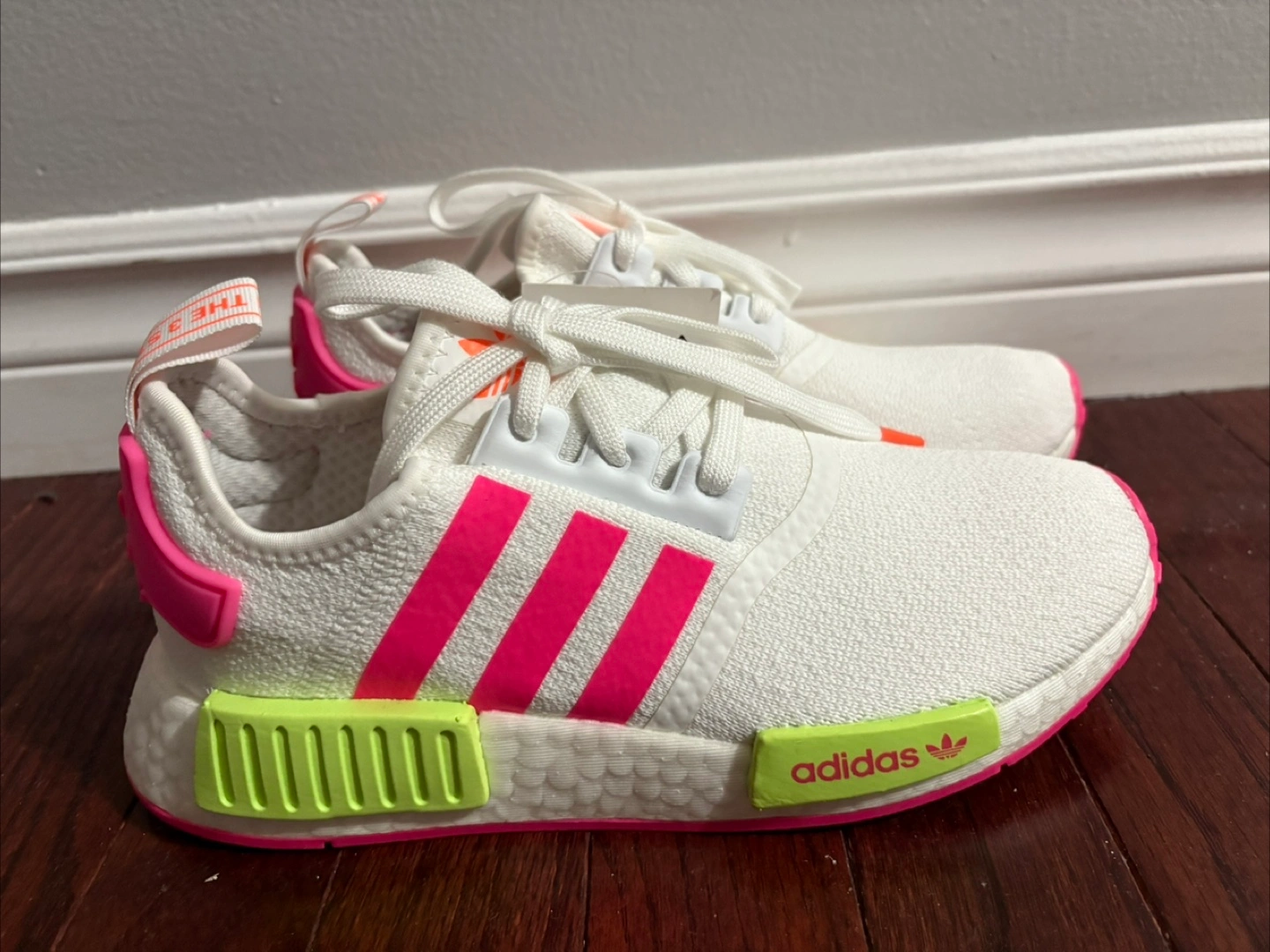 10BRAND NEW. NEVER USED w/ tag. Women's Adidas NMD_R1 running shoes. White knit upper, pink and lime accents. Boost midsole. Asking $90 obo.