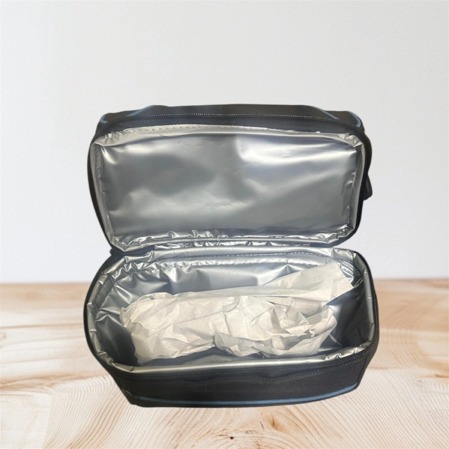 Reusable lunch bag. Black exterior with light blue trim. Zipper closure. Insulated interior. Perfect for work or school. Brand new