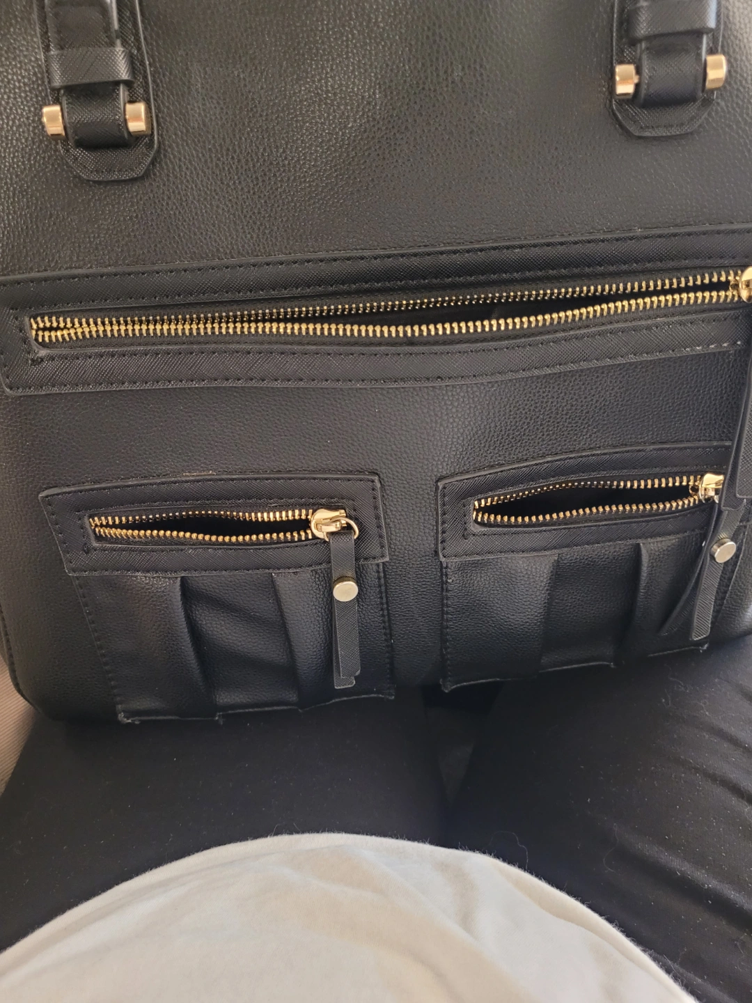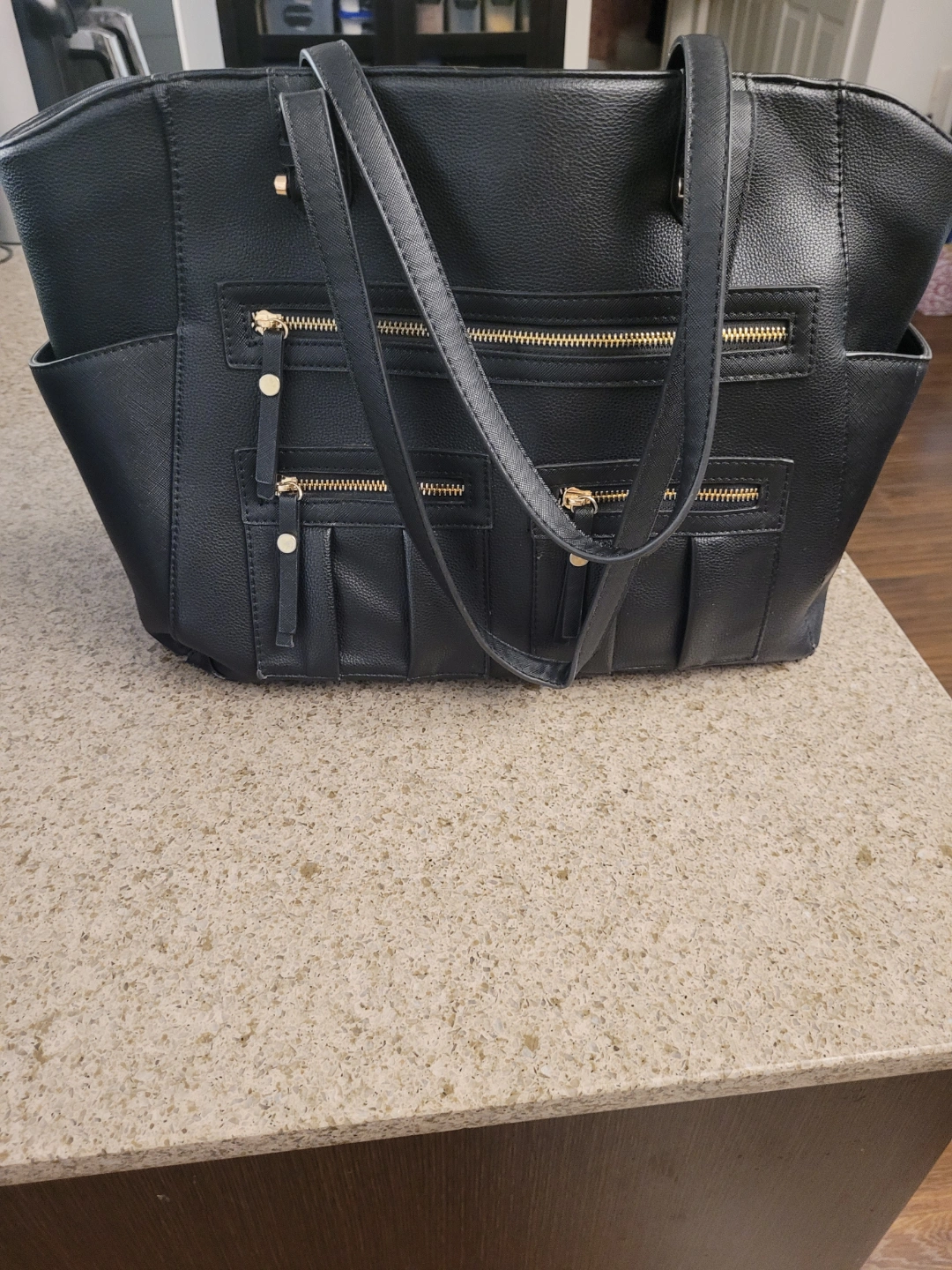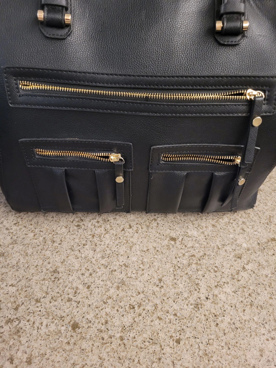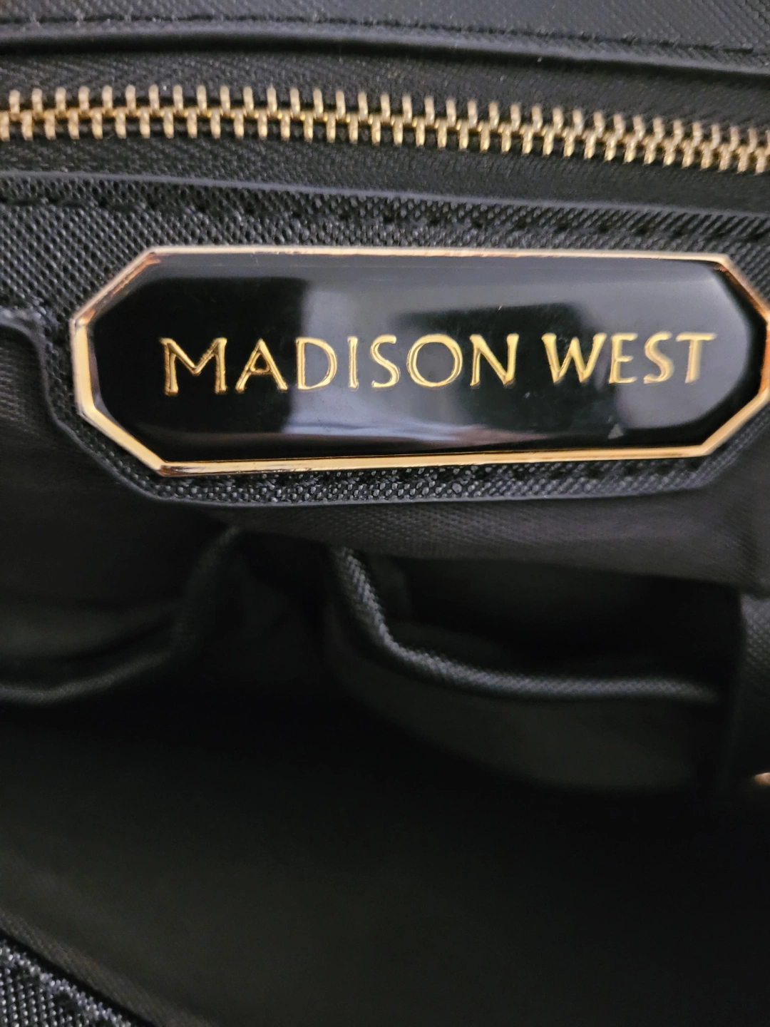 PLEASE SEE ALL PICTURES Large MADISON WEST black tote bag. Features multiple zippered pockets, both inside and out. Gold-toned hardware accents. Two top handles for carrying.
