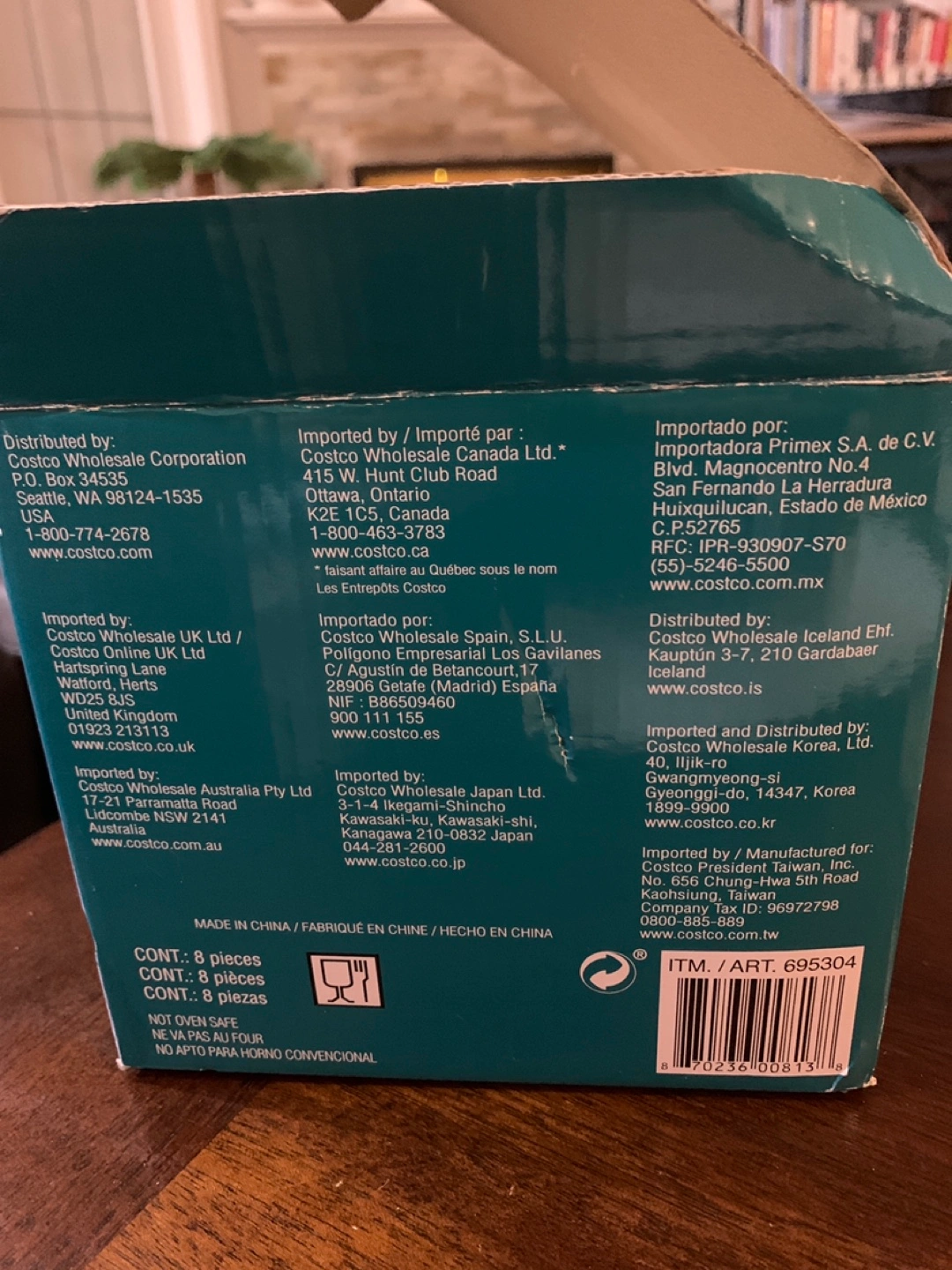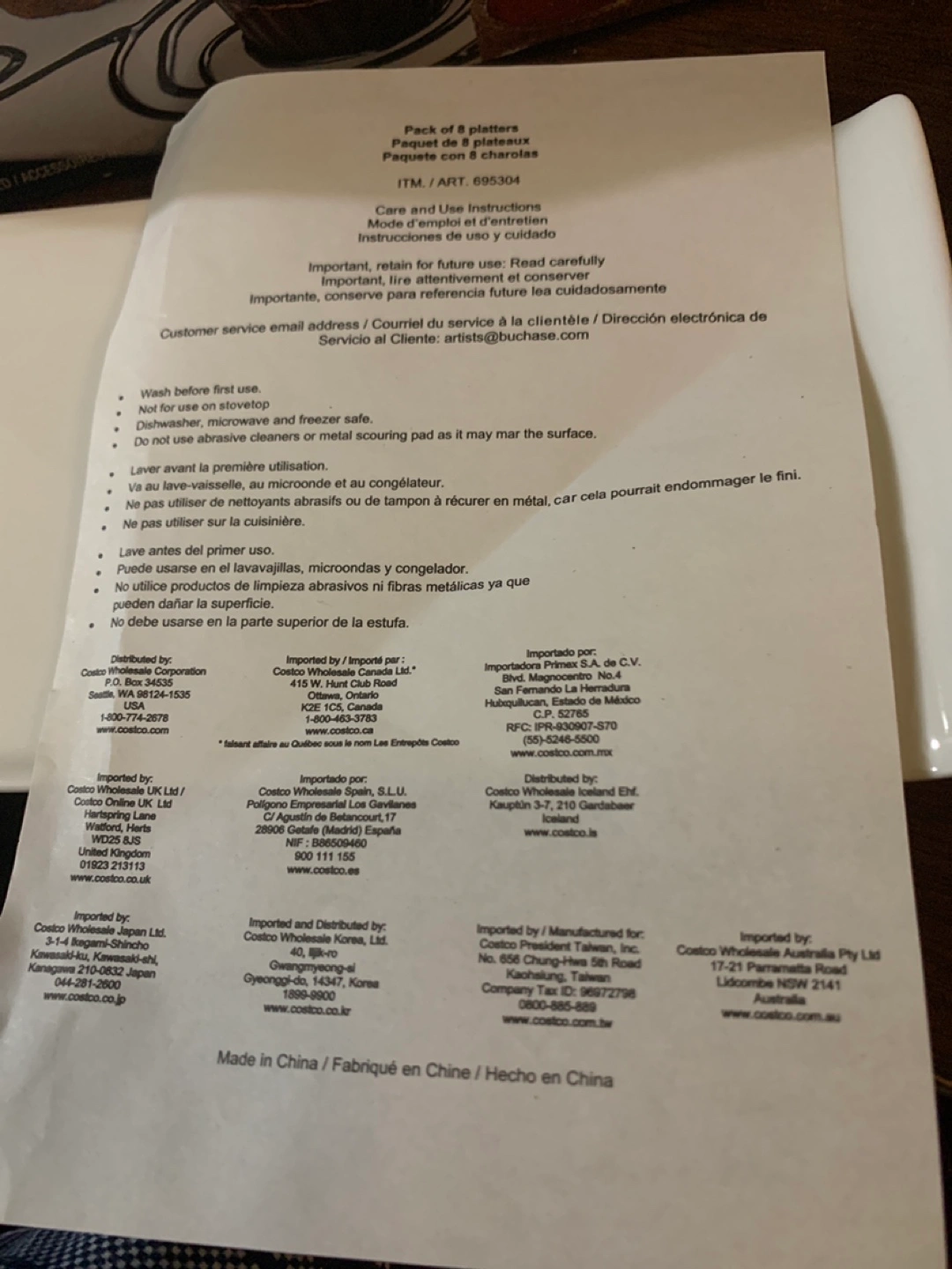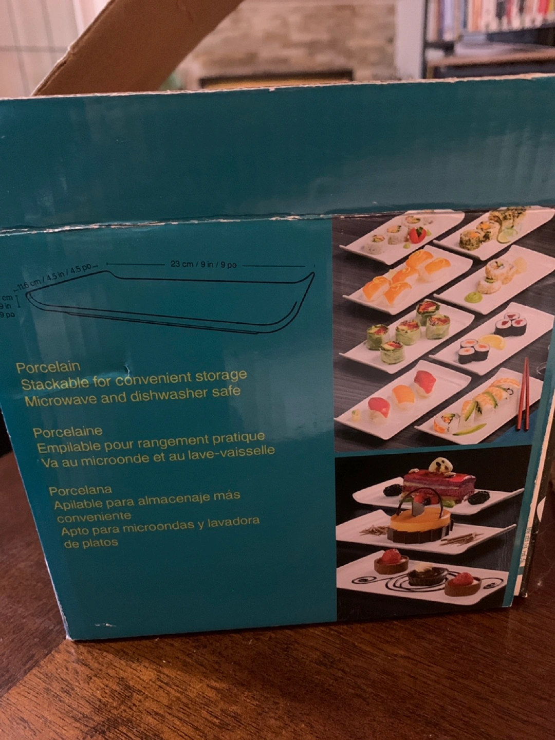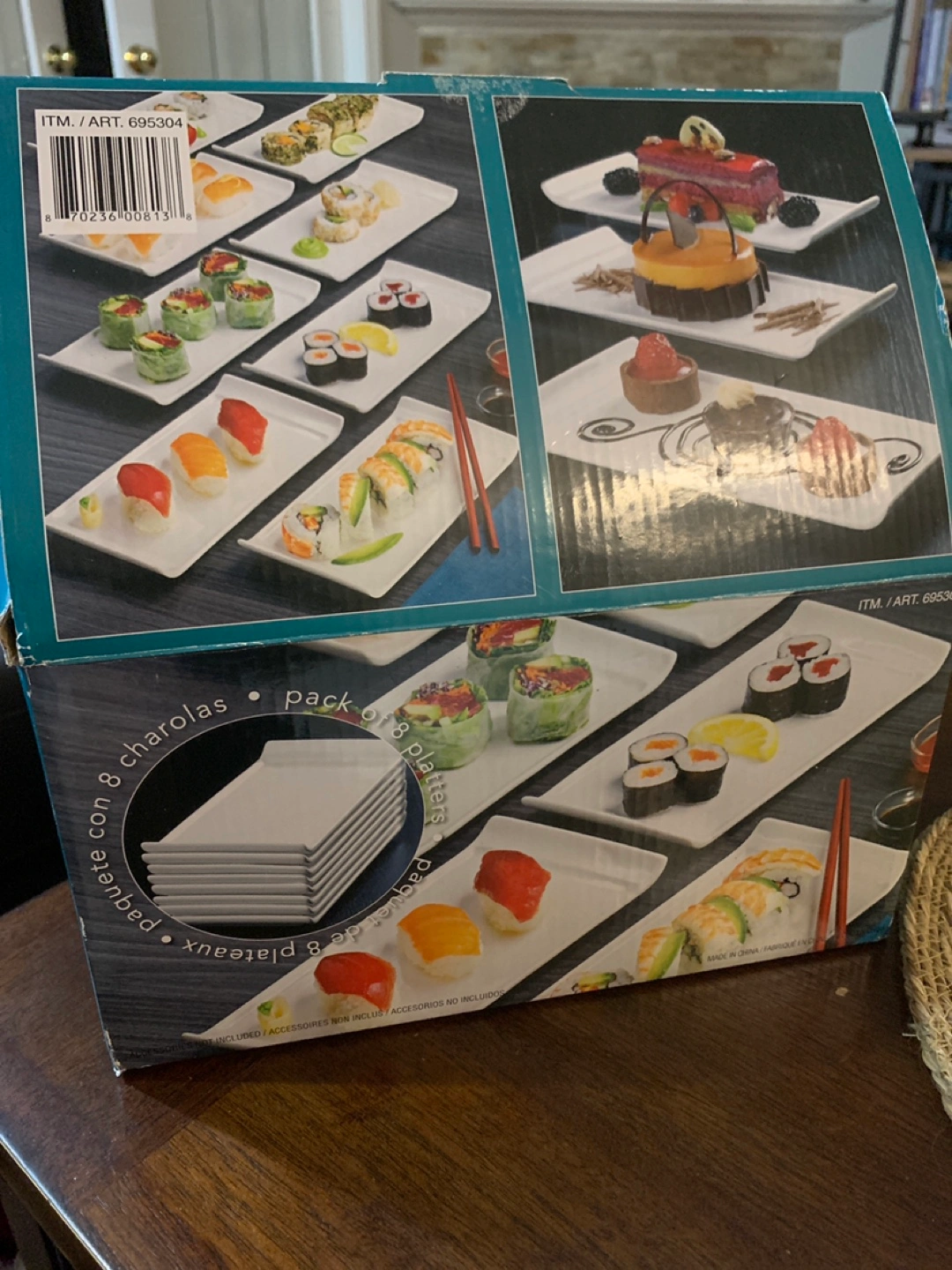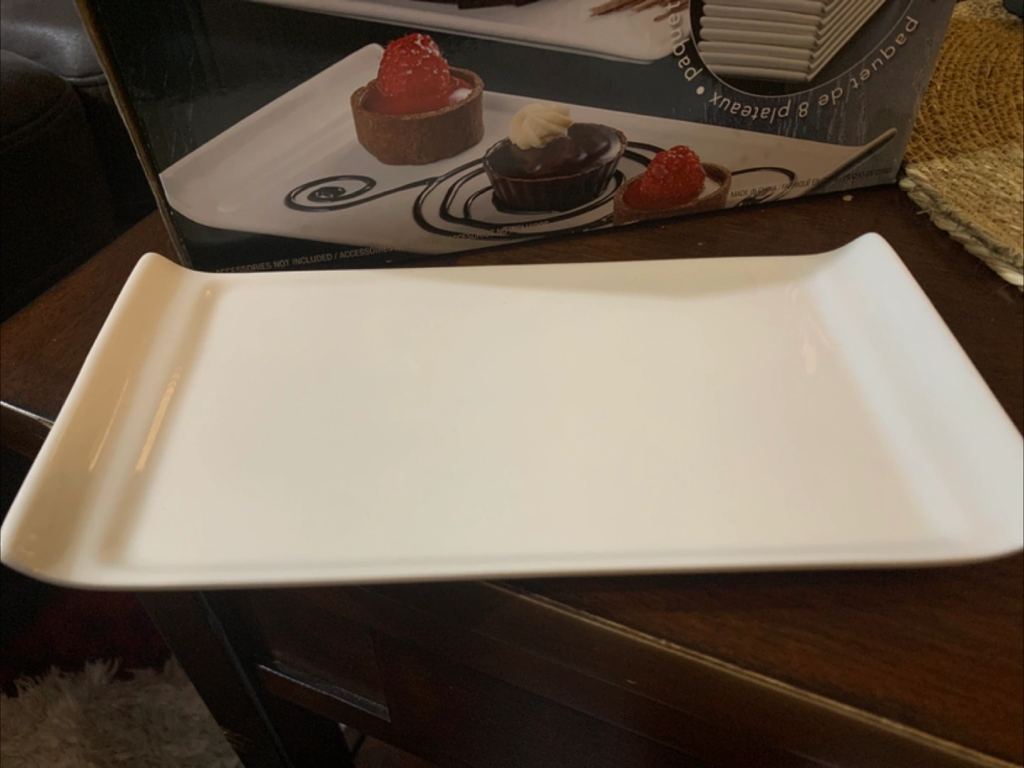 Eight white porcelain dessert plates. Stackable for convenient storage. Microwave and dishwasher safe. Plates feature a slightly curved edge. New in box.