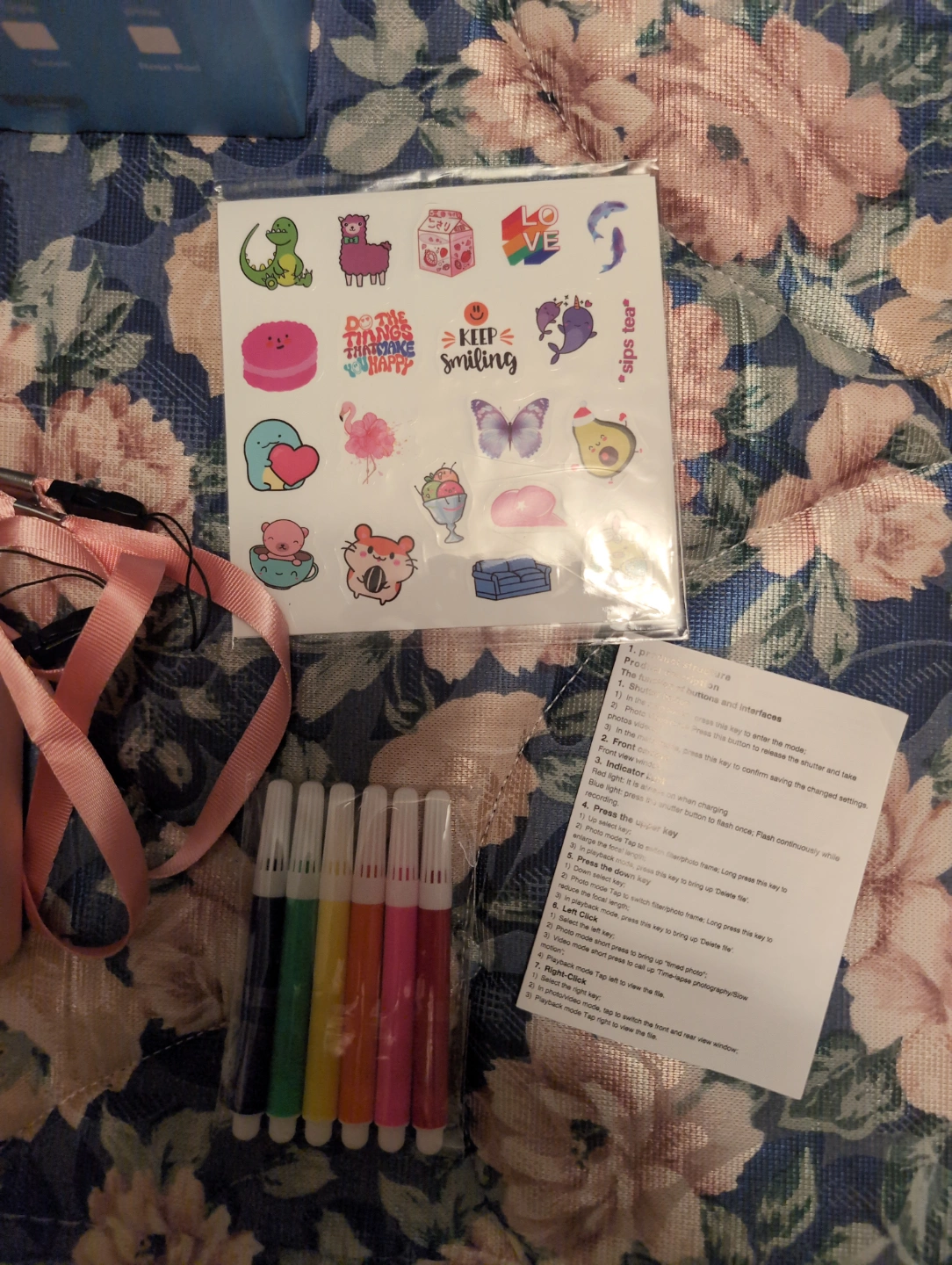 Pink instant digital camera. Includes stickers, markers, and neck strap. Great for kids. Requires batteries.thtee rolls of printing paper takes videos Pic games fun