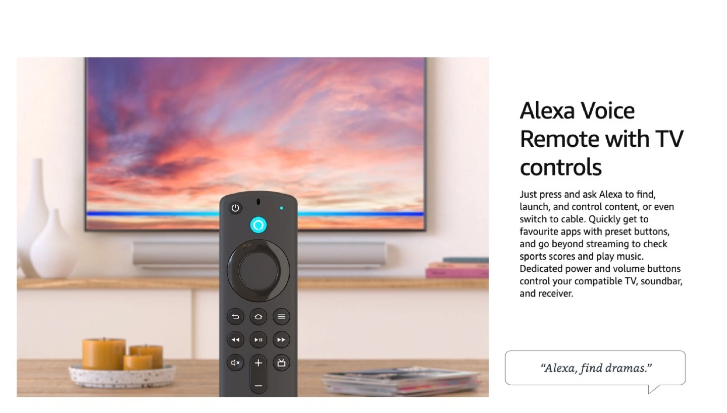 • Alexa Voice Remote - Search and launch content with your voice. Get to favourite apps quickly with preset buttons. Control power and volume with one remote