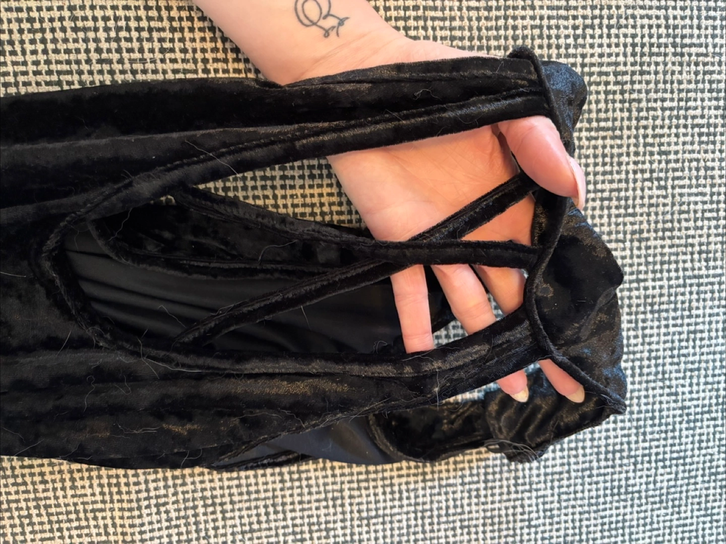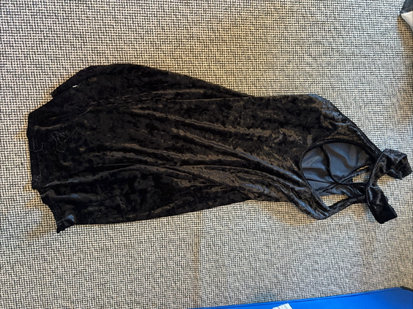 Black velvet mini dress. Halter neckline. Open neck detail. Size medium.