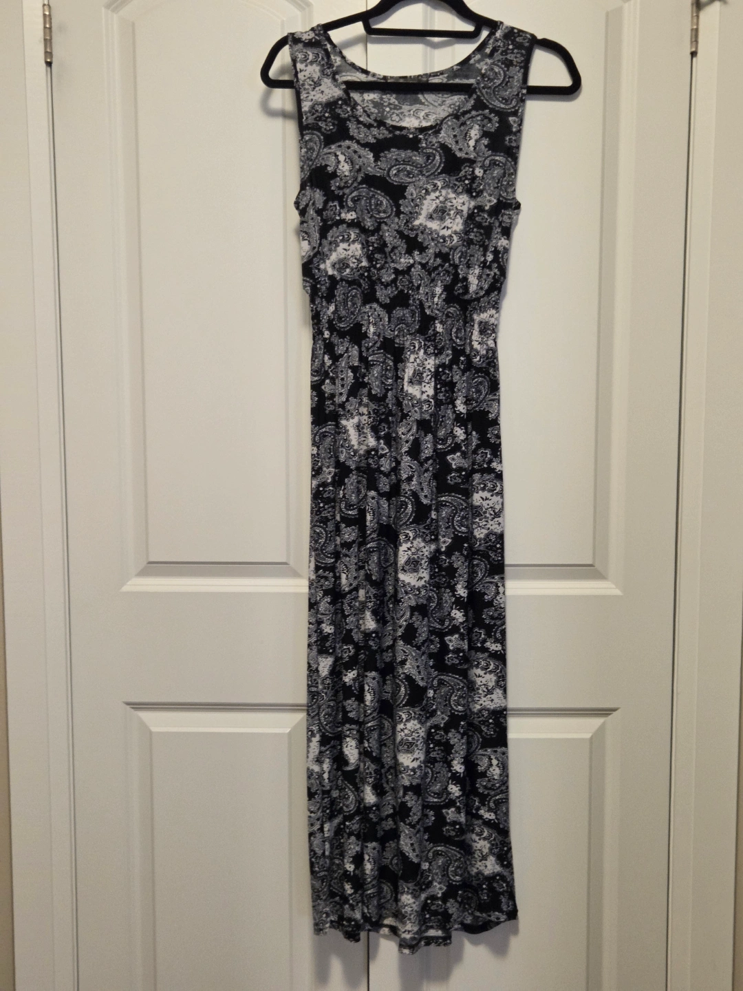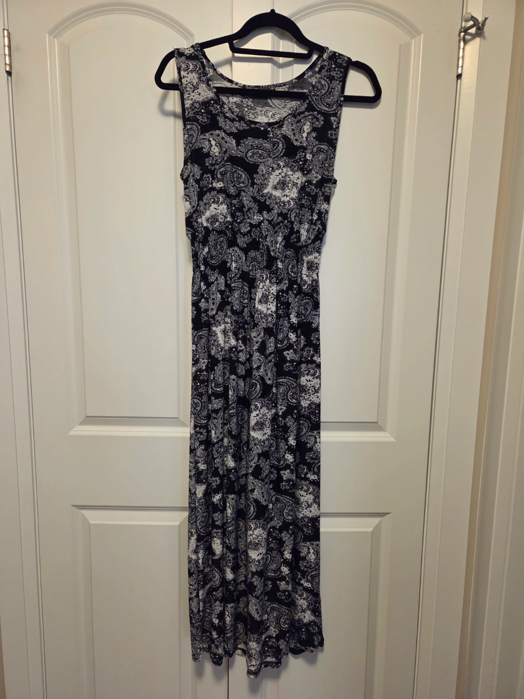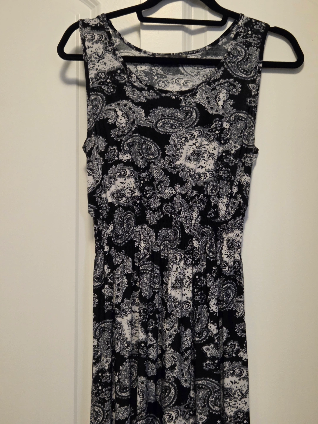 21Sleeveless maxi dress. Black and white paisley print. G/L sizing. Relaxed fit.