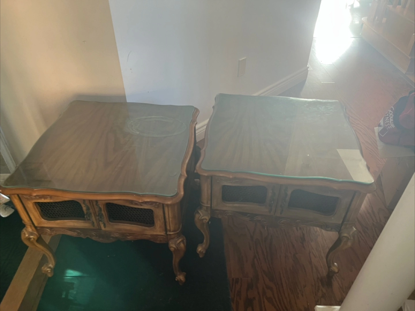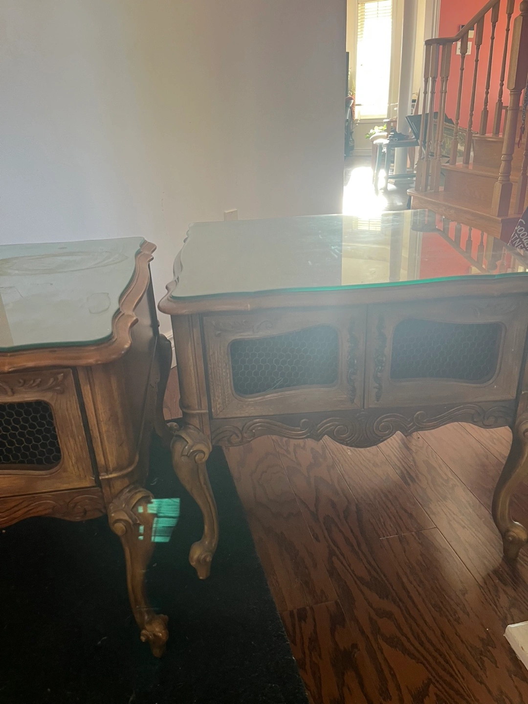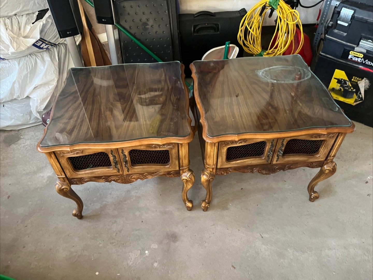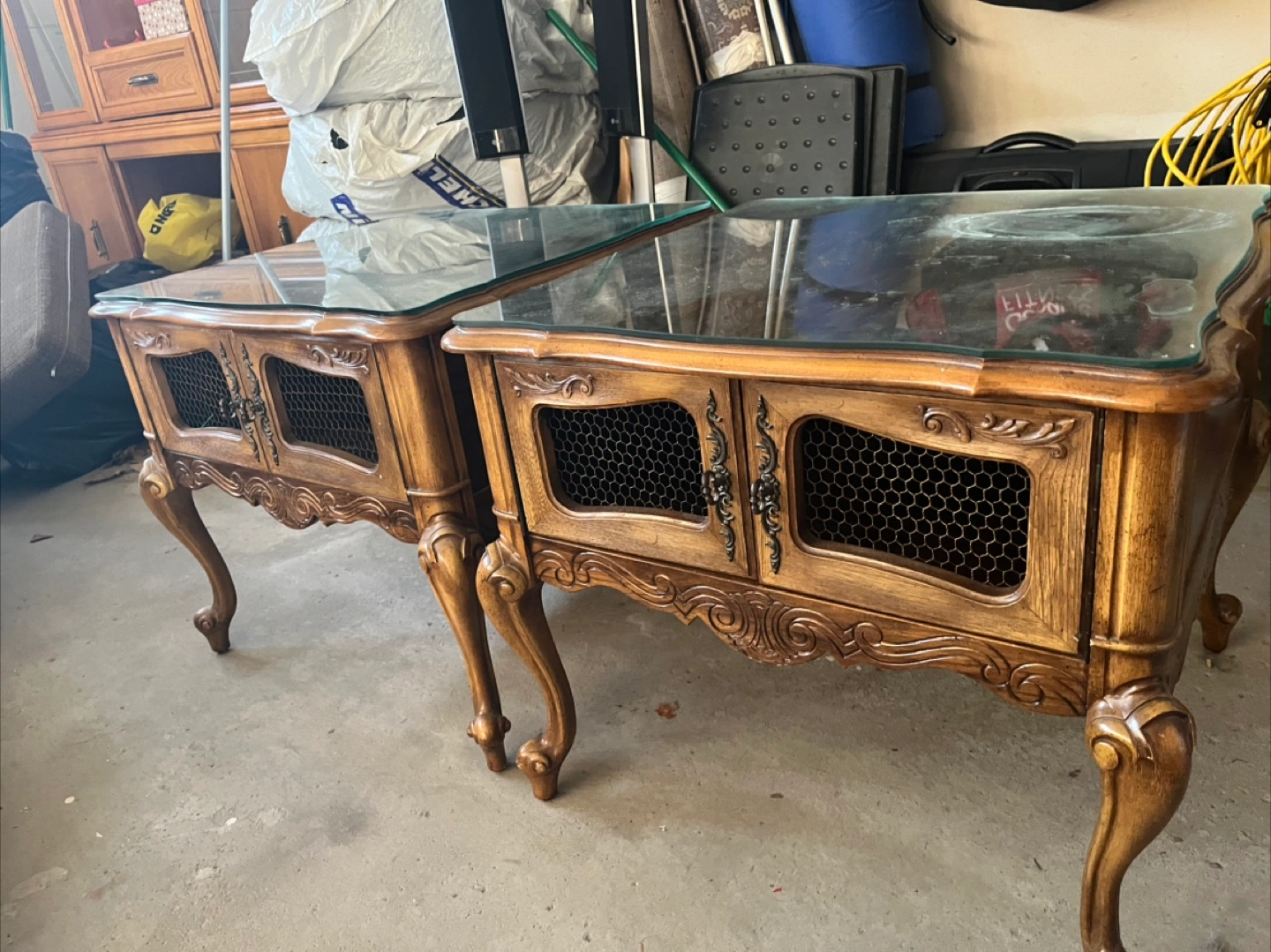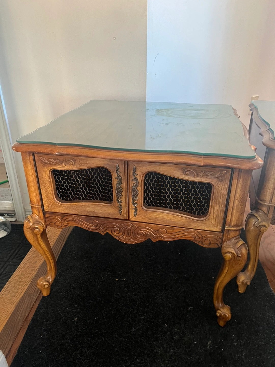 Matching pair of ornate end tables. Features carved detailing, glass tops, and wire mesh inserts. Solid wood construction. Minor wear consistent with age and use.