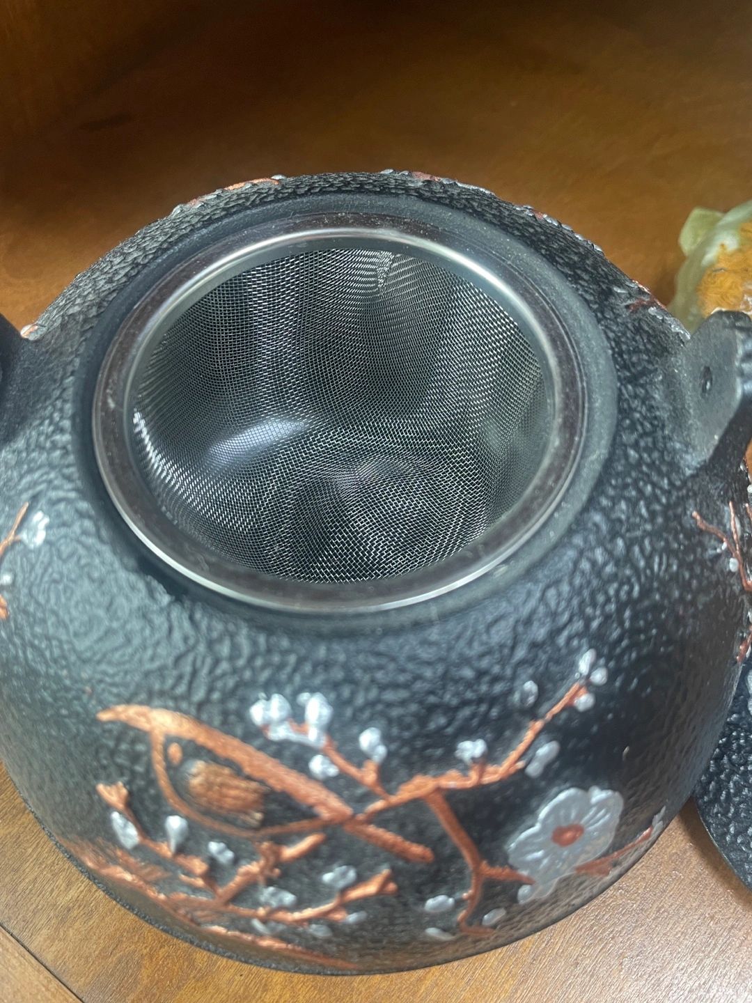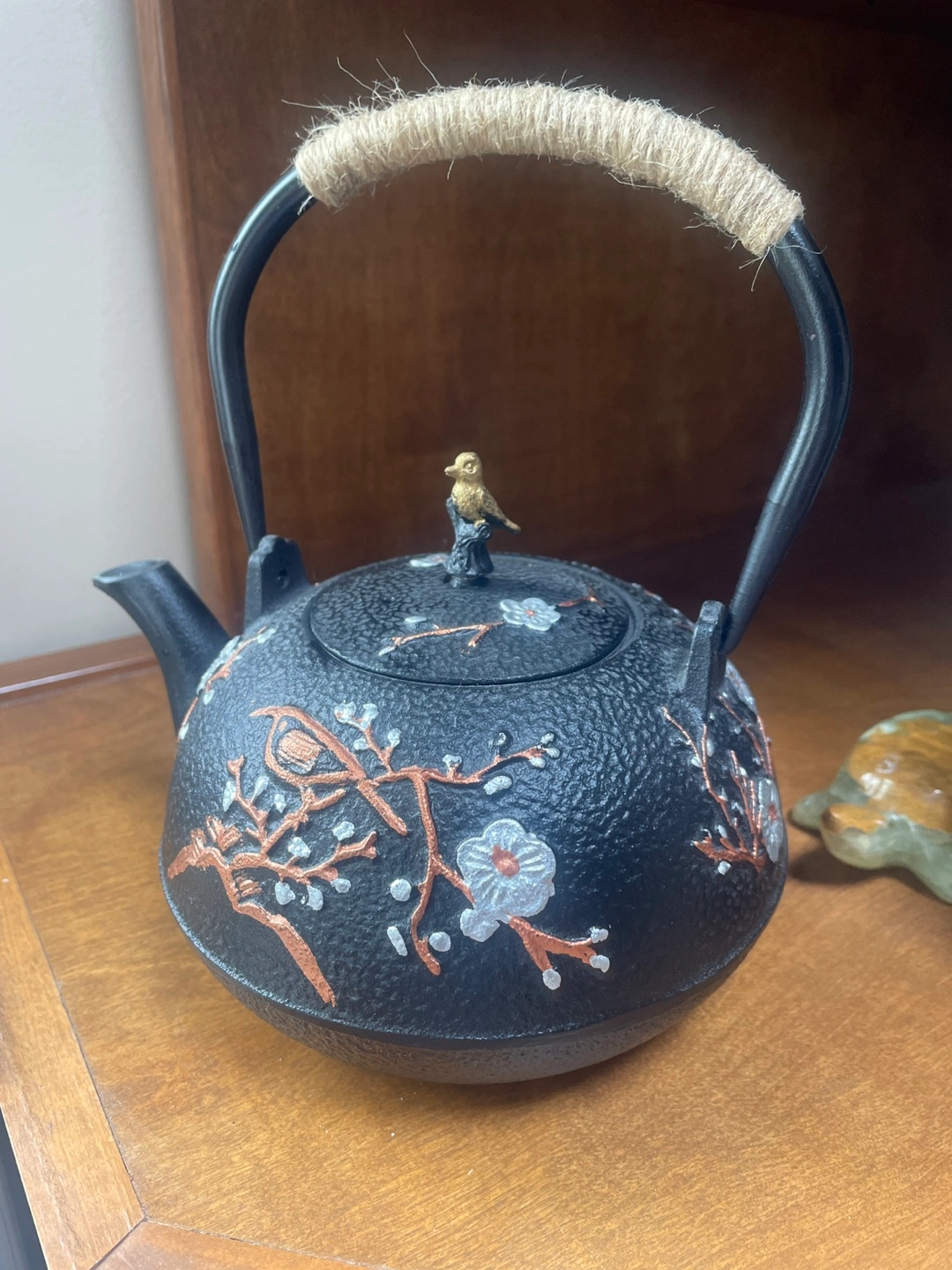 Beautiful black cast iron teapot. Never been used. Features a removable infuser. Decorated with a copper and white floral design and a small gold bird on the lid. Rope handle.