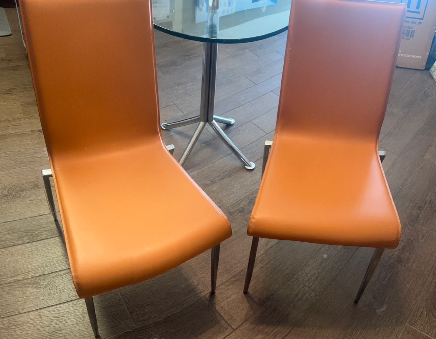 Two stylish dining chairs. Sleek chrome legs. Tan leatherette seats and back Contemporary design. Perfect for a small kitchen table or condo apartment. Small tears and wears (see all pictures)