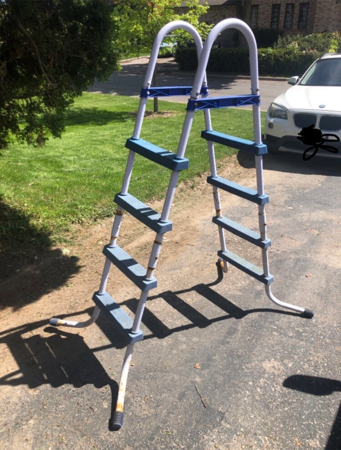 Used pool ladder. Shows some rust. Good condition otherwise. Four steps per side. Durable metal frame. Blue plastic steps.