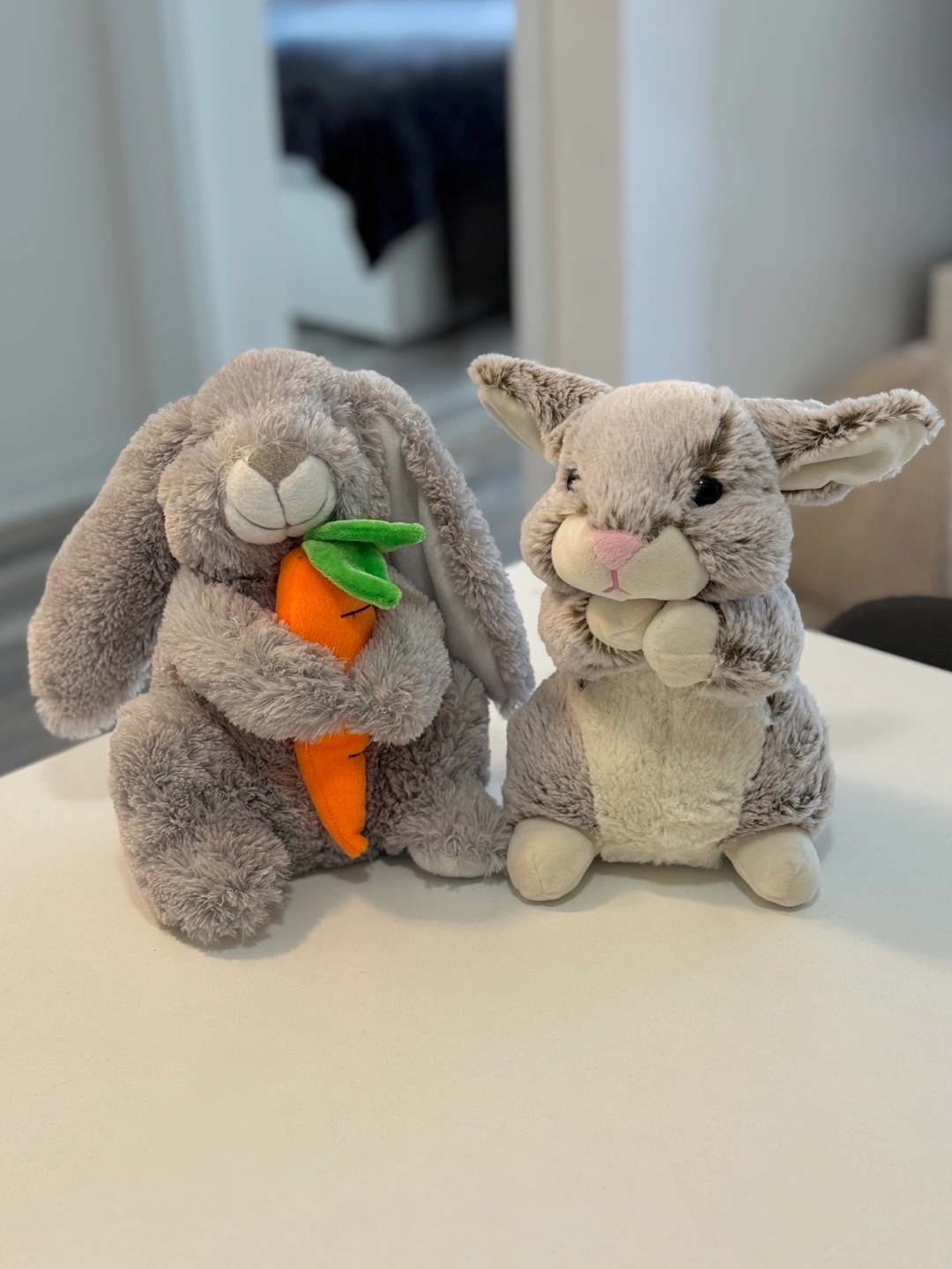 327Two adorable grey plush bunnies. One bunny holds a carrot. Soft and cuddly. Perfect for Easter or any time. Only pick up, please Sheppard Ave W & Bathusrt St