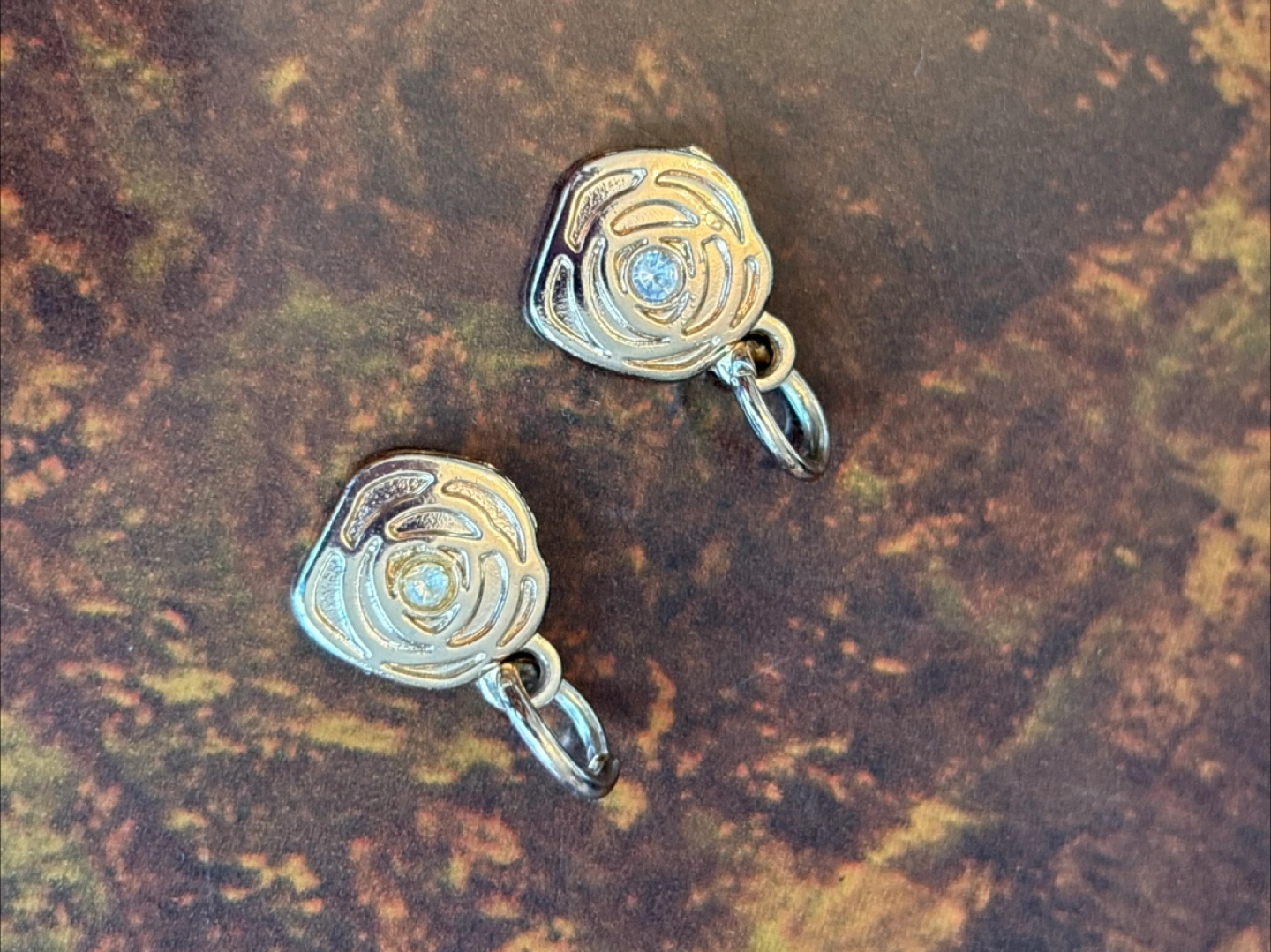 Pair of silver-toned metal charms. Rose design. Features a small clear stone in the centre. Small loop for attaching to jewellery.