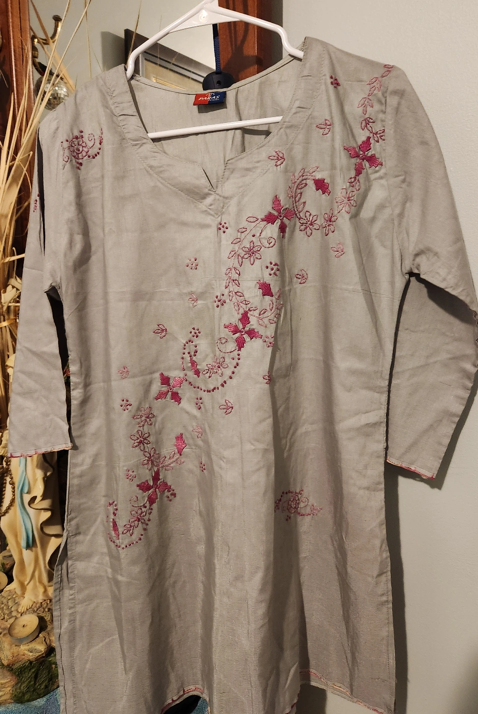 Grey, embroidered, three-quarter sleeve tunic top. Pink floral embroidery detail. V-neckline. Relaxed fit.
