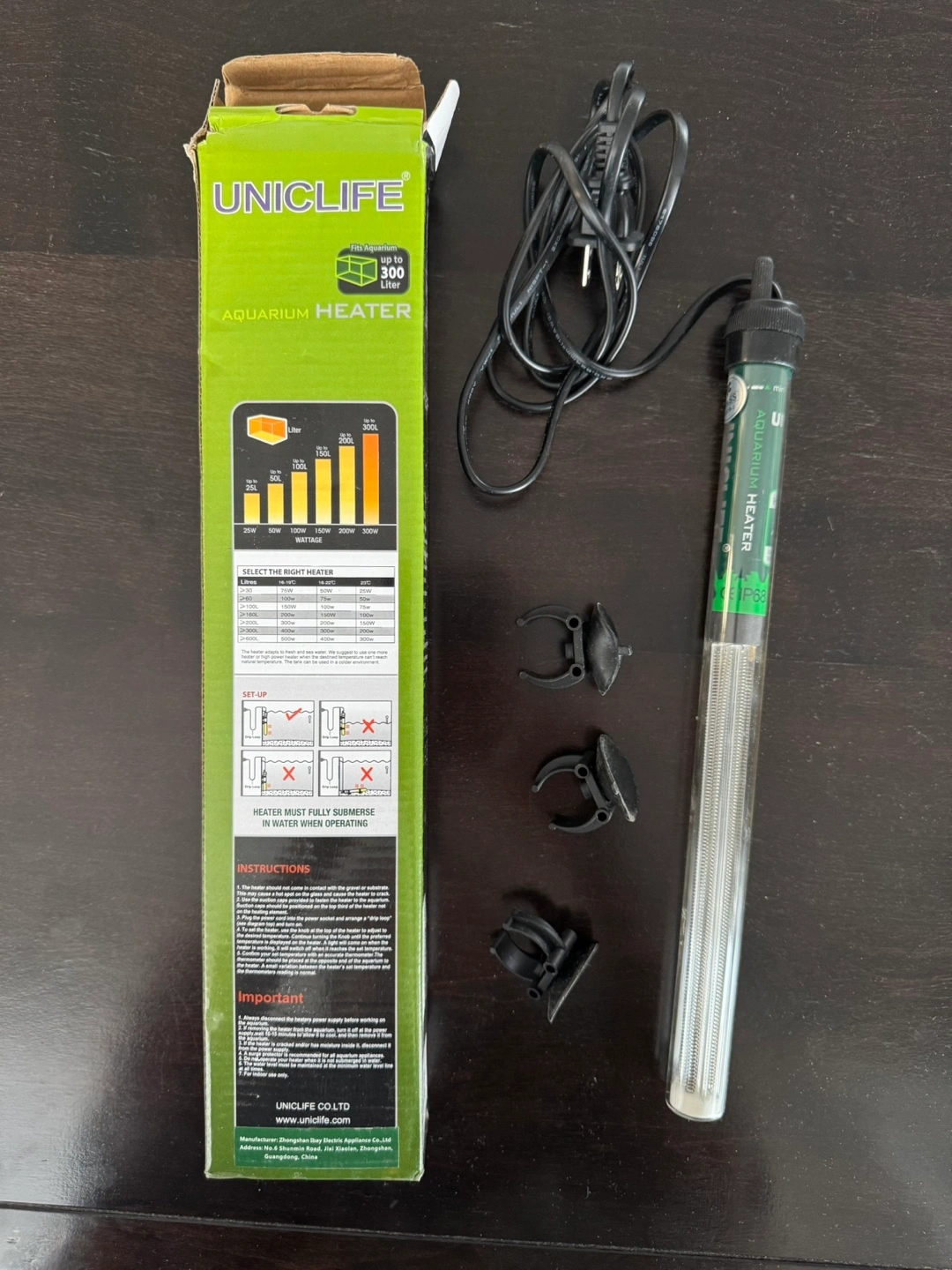 Submersible aquarium heater rod with electronic thermostat LED indicator light. Includes mounting brackets. Good fo aquariums up to 80 gallons. Works great.