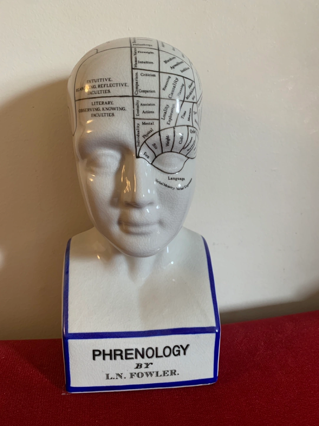 Vintage porcelain bust depicting a phrenological chart. Features a detailed head with numbered sections and labels. Base indicates it's by L.N. Fowler.