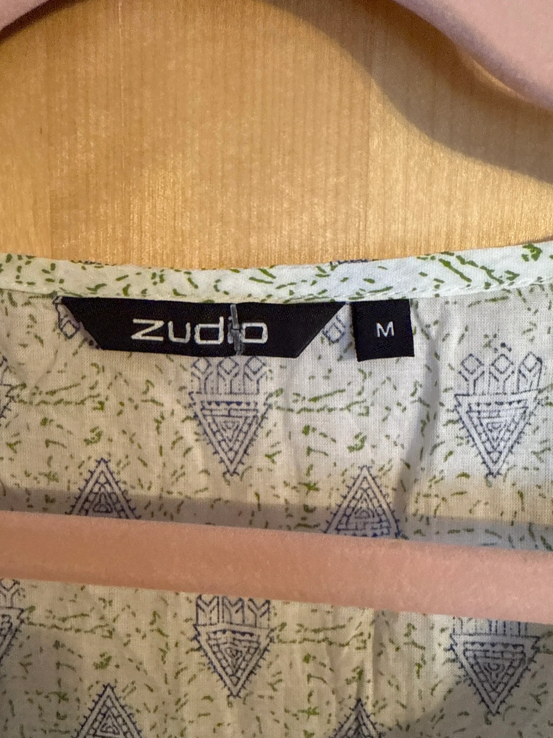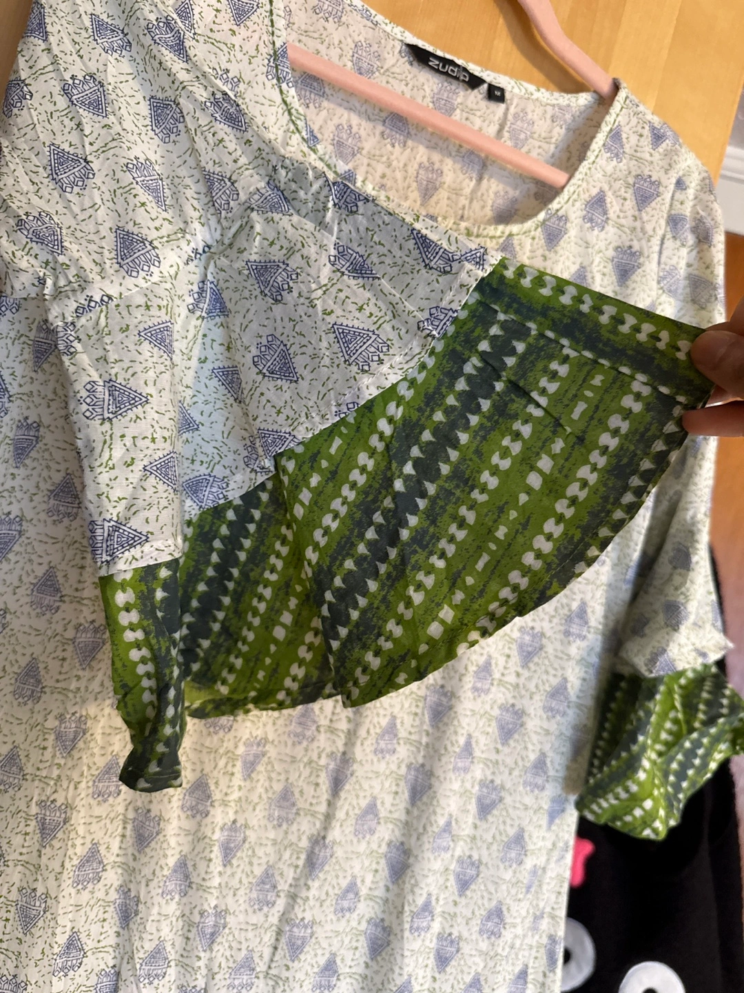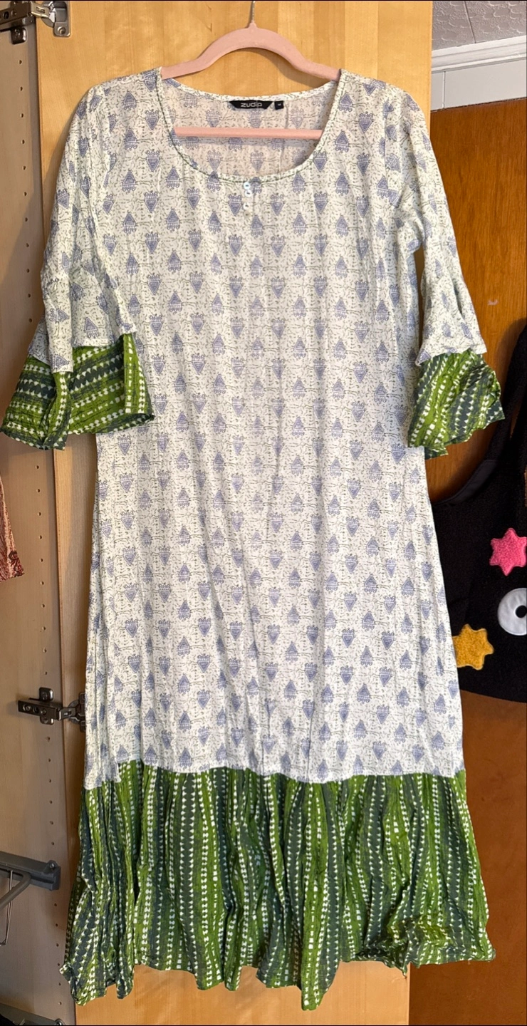 Beautiful, lightweight cotton dress. Features a unique green and white pattern. Three-quarter sleeves with ruffled detailing. Relaxed fit. Great for spring or summer.