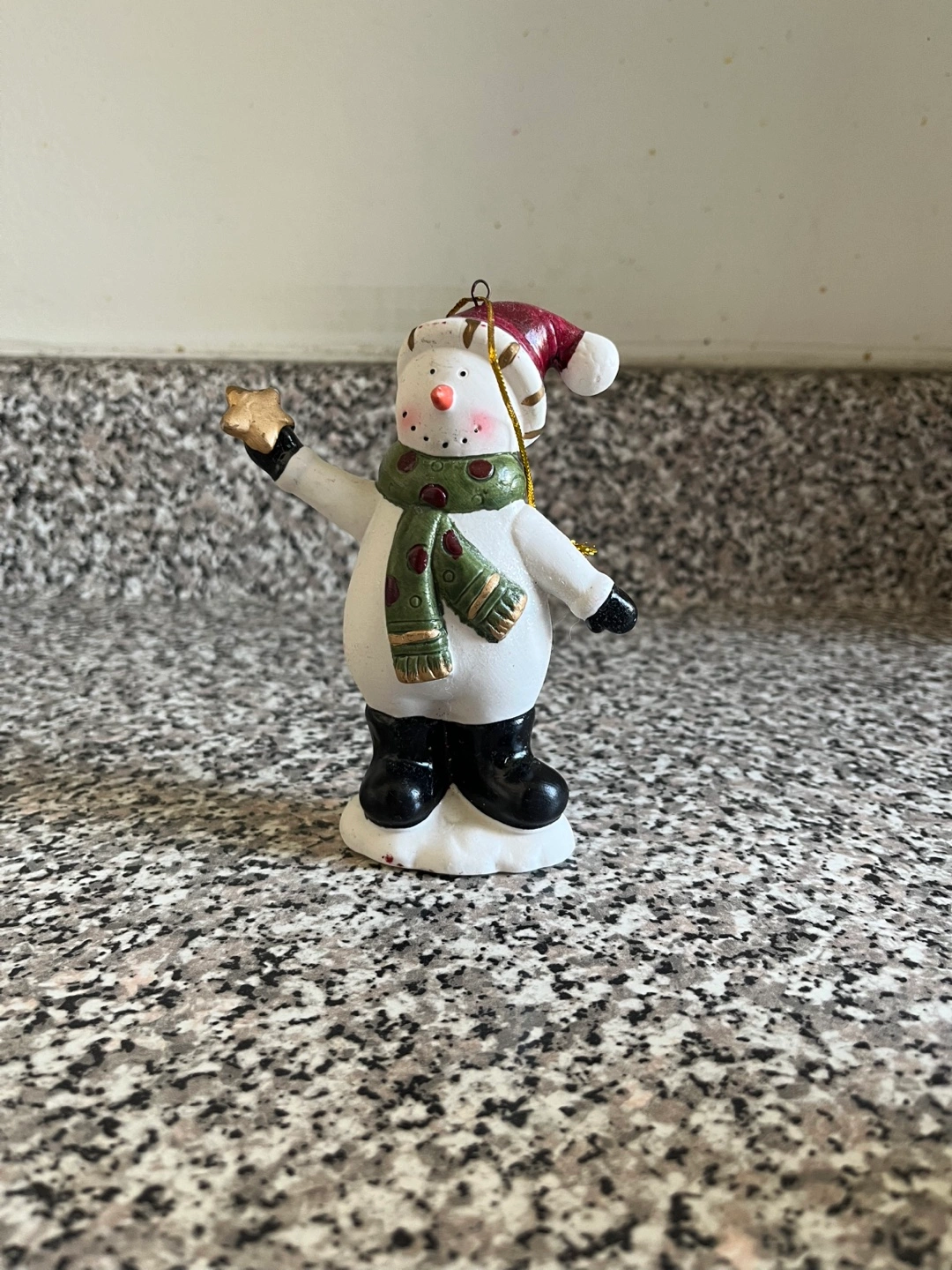 Charming snowman figurine. Perfect holiday decoration. Holds a star. Features a red hat and green scarf. It’s an ornament for your Christmas tree or for a mantle as a figurine. Pick up only