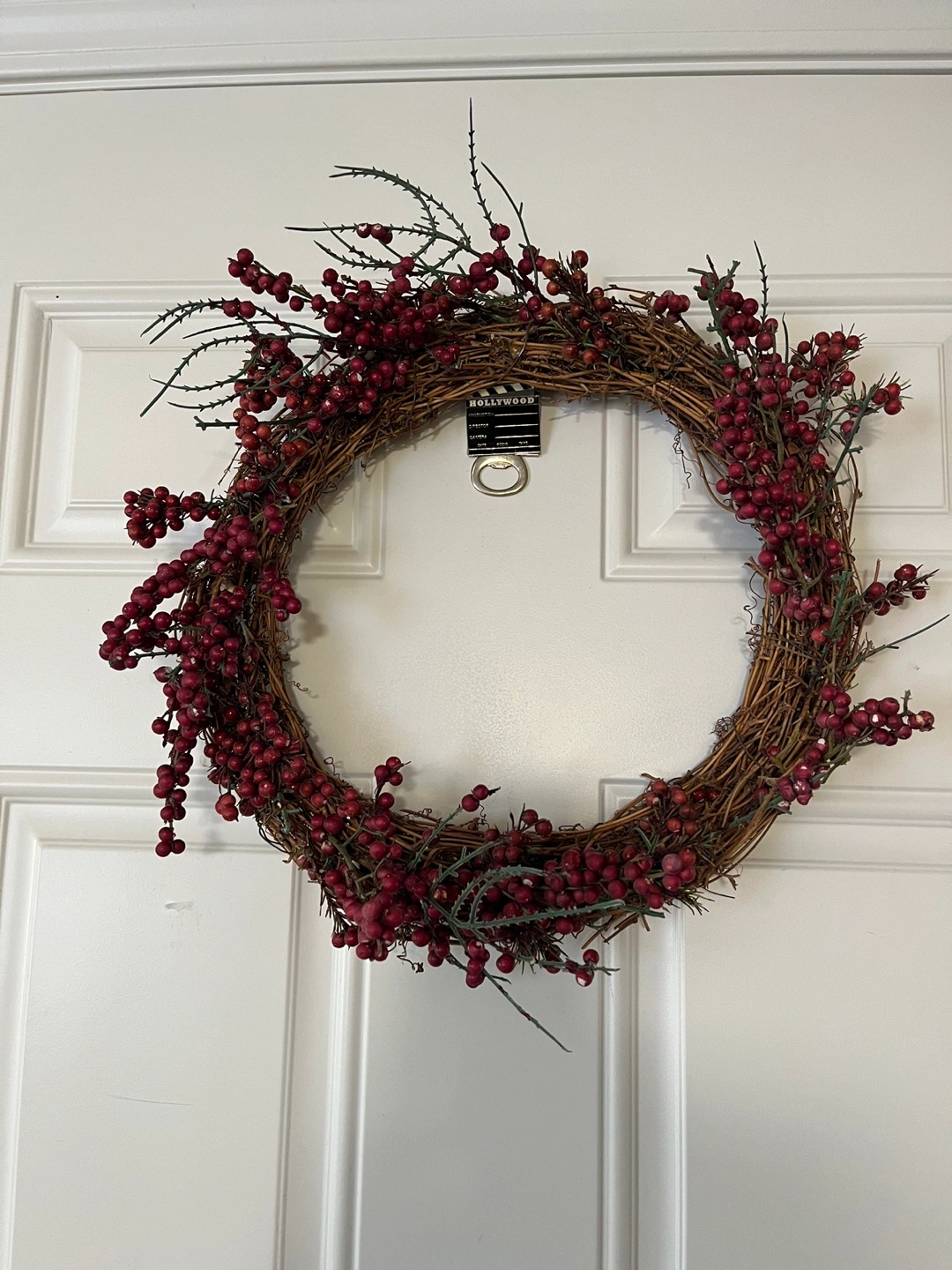 10Gorgeous autumnal wreath. Perfect for fall or winter decor. Features a grapevine base and dark red berries. Adds a touch of elegance to any space.