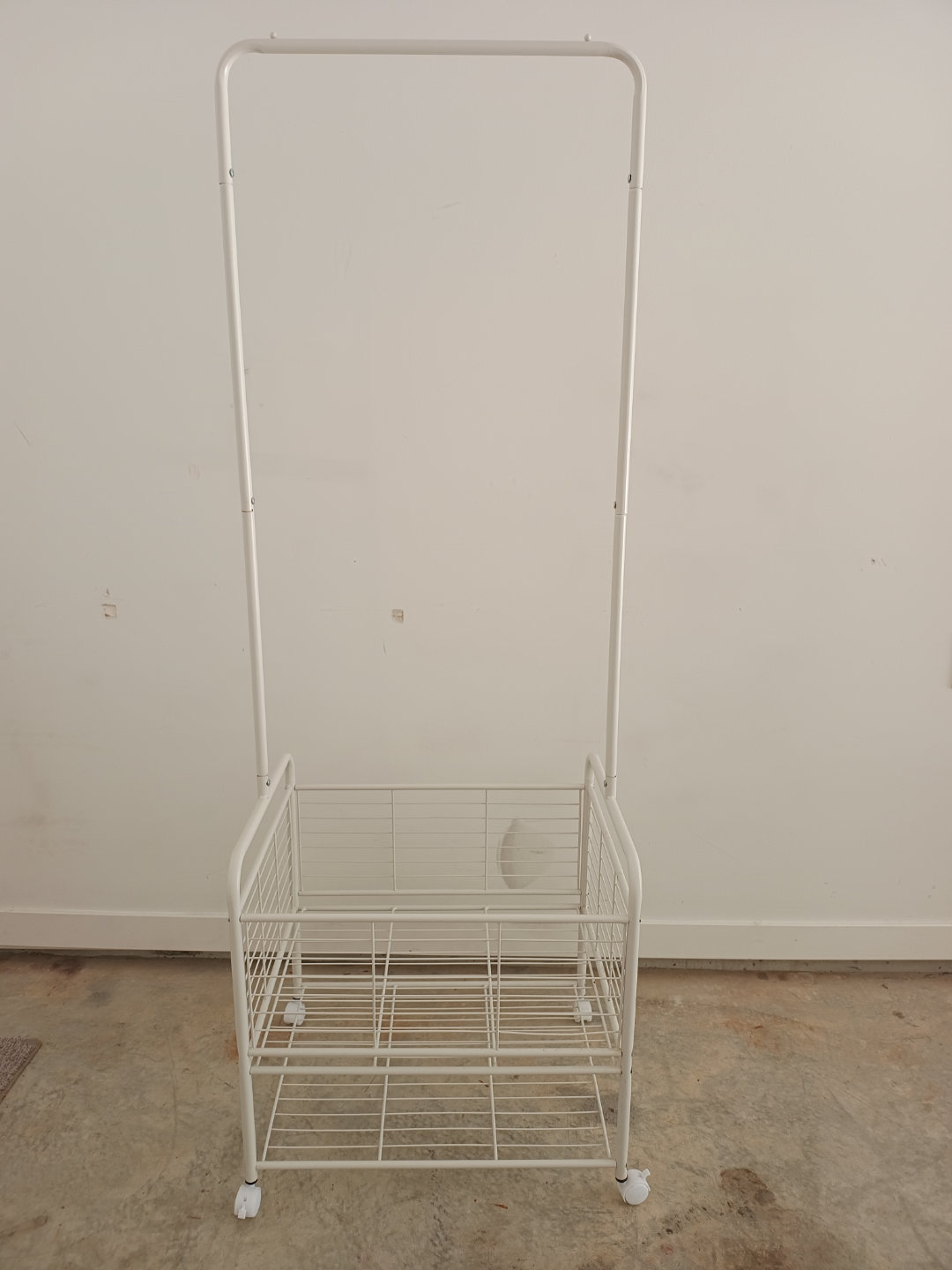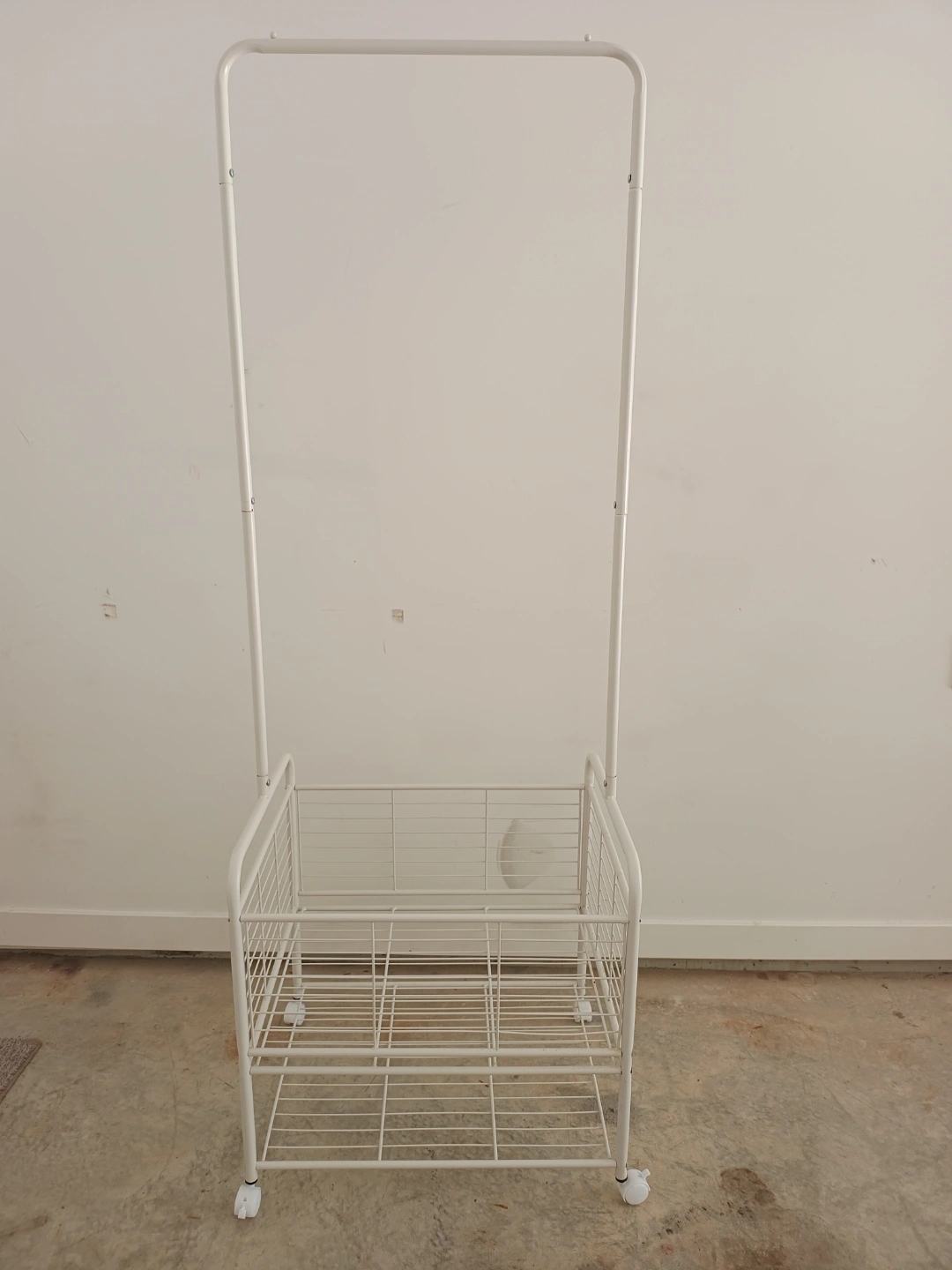 Freestanding garment rack. Features a hanging rod and two wire shelves. Metal construction. Rolls on wheels. Great for laundry area.