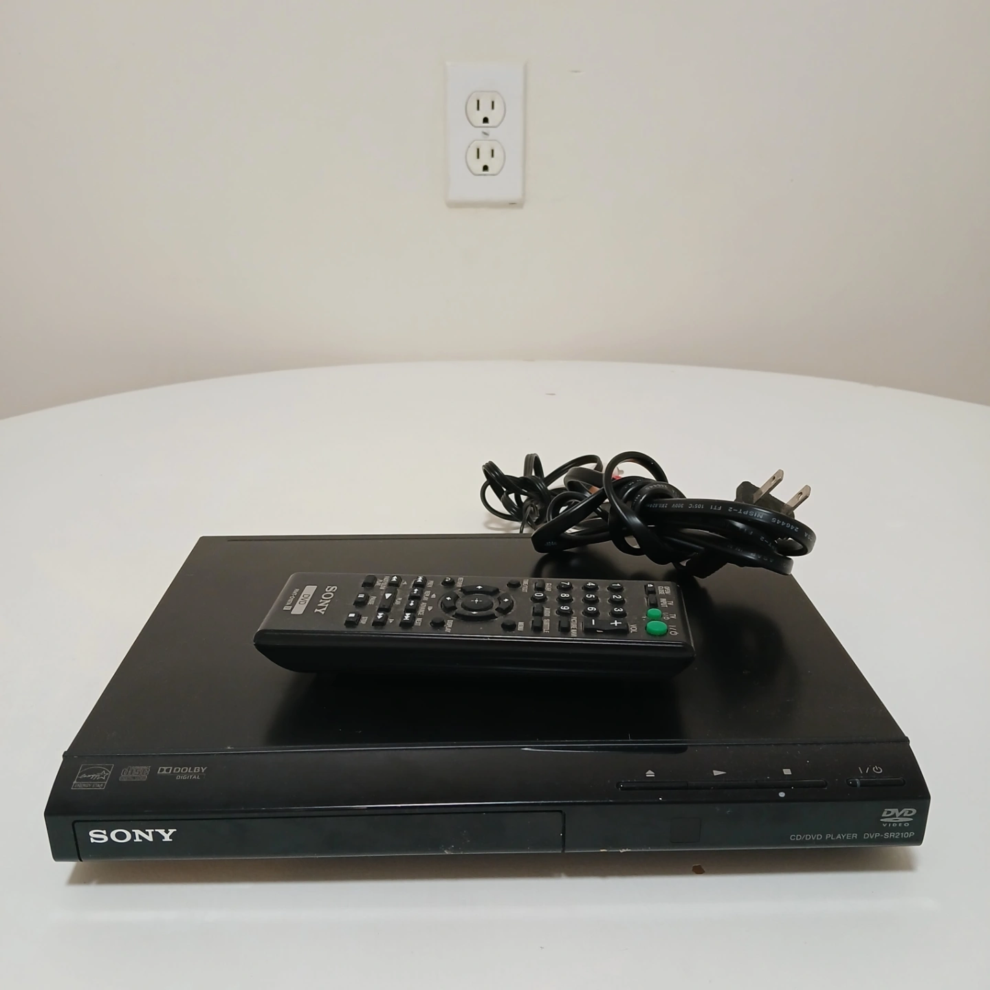 Sony DVD player model DVP-SR210P. Includes remote and cables. Plays DVDs and CDs. Compact design. Pre-owned. No HDMI input
