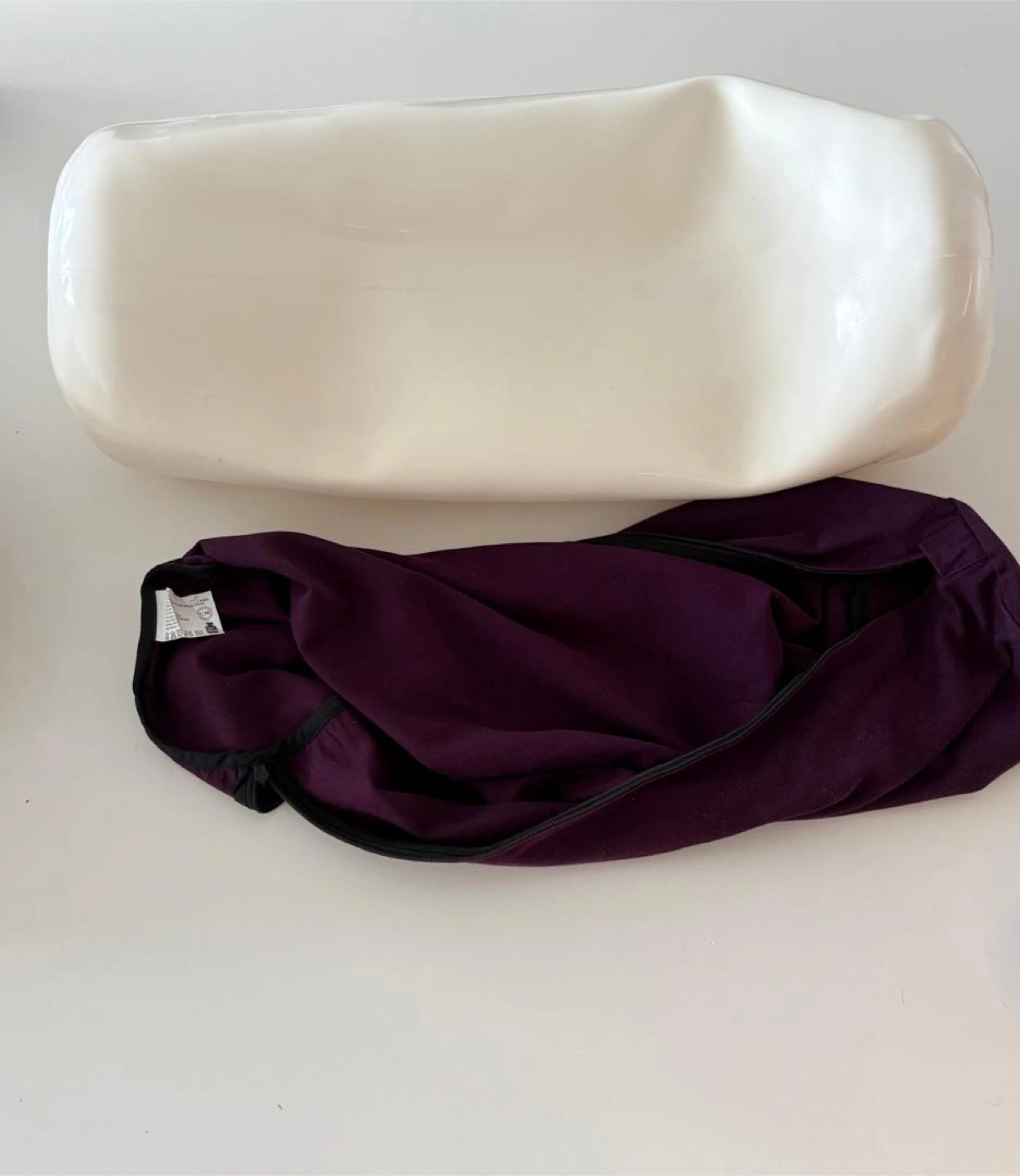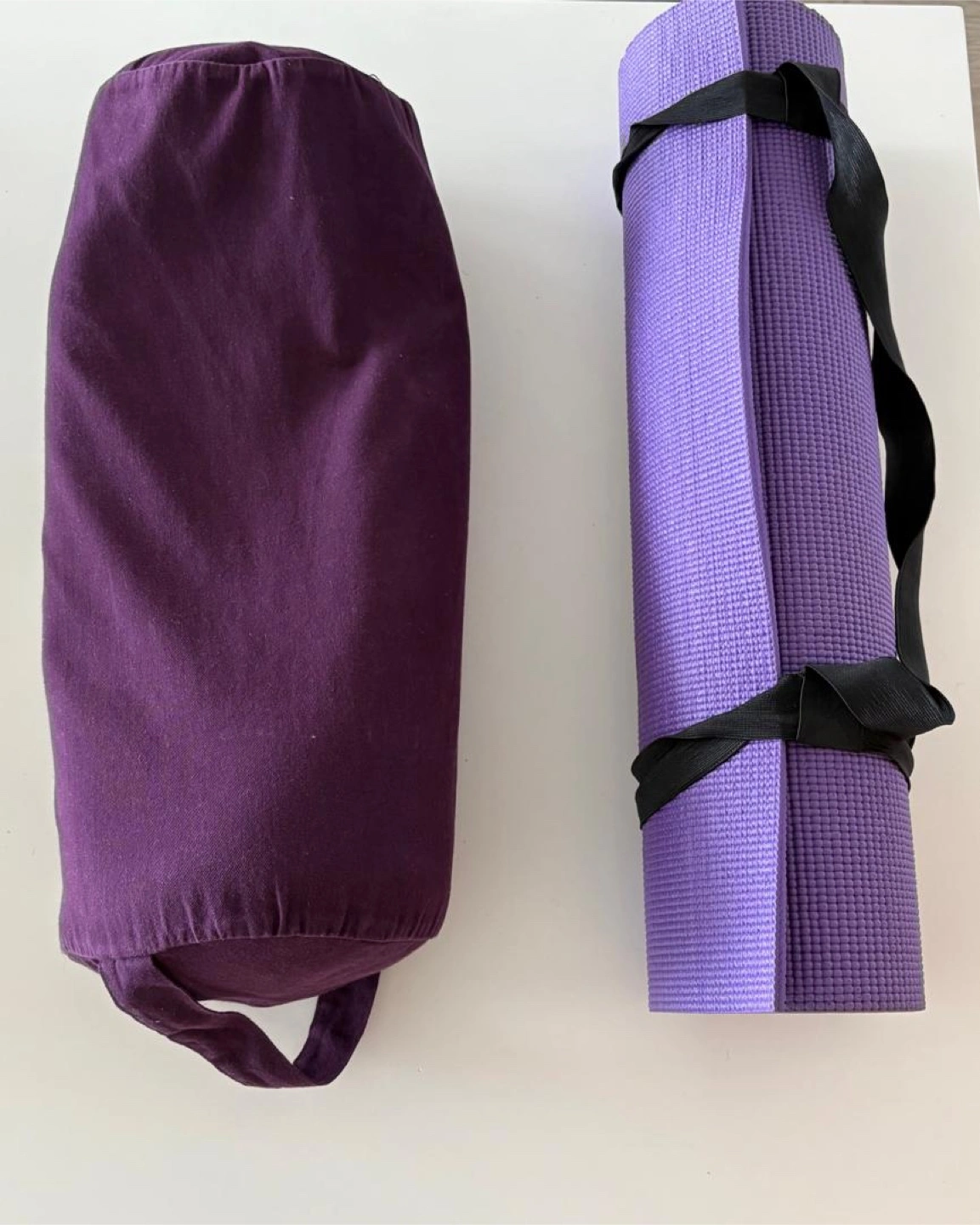 Yoga bolster and mat set. Bolster cover is dark purple, removable, and zippered. Mat is light purple. Both are in good used condition.
