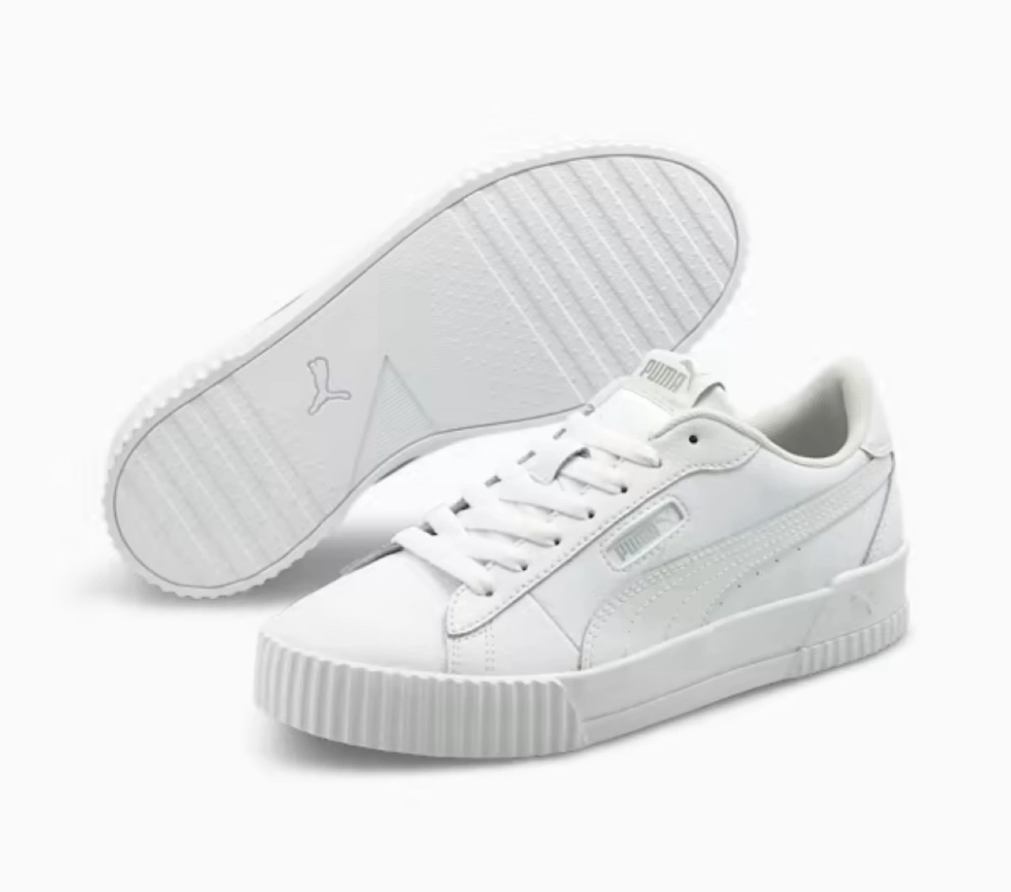 Get ready to step out in style with these Puma Carina L sneakers! These all-white shoes offer both quality and style featuring a sleek leather upper, lace-up closure, and durable rubber sole, perfect for adding a touch of sporty elegance to any outfit. They are in excellent condition, ready for their next adventure.