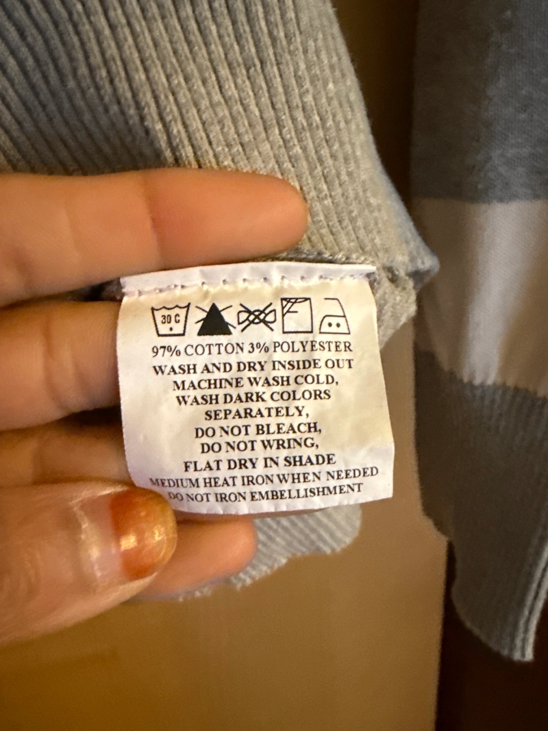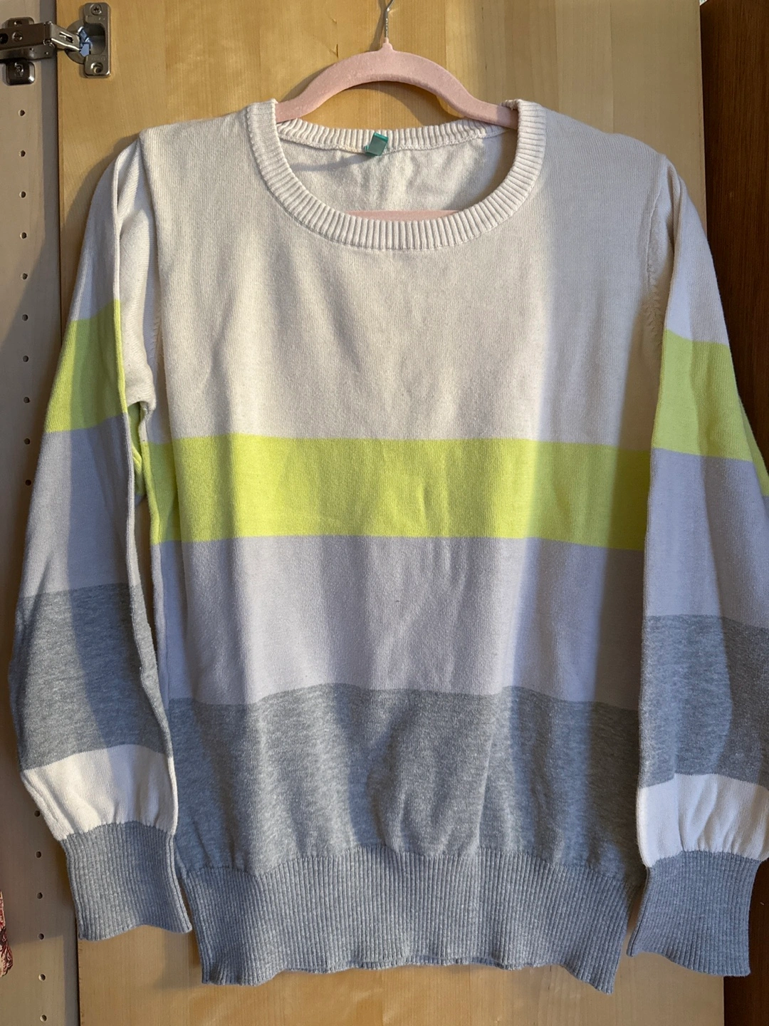 Cream, grey, and light yellow horizontal striped long-sleeved sweater. Crew neck. 97% cotton, 3% polyester. Machine wash cold.