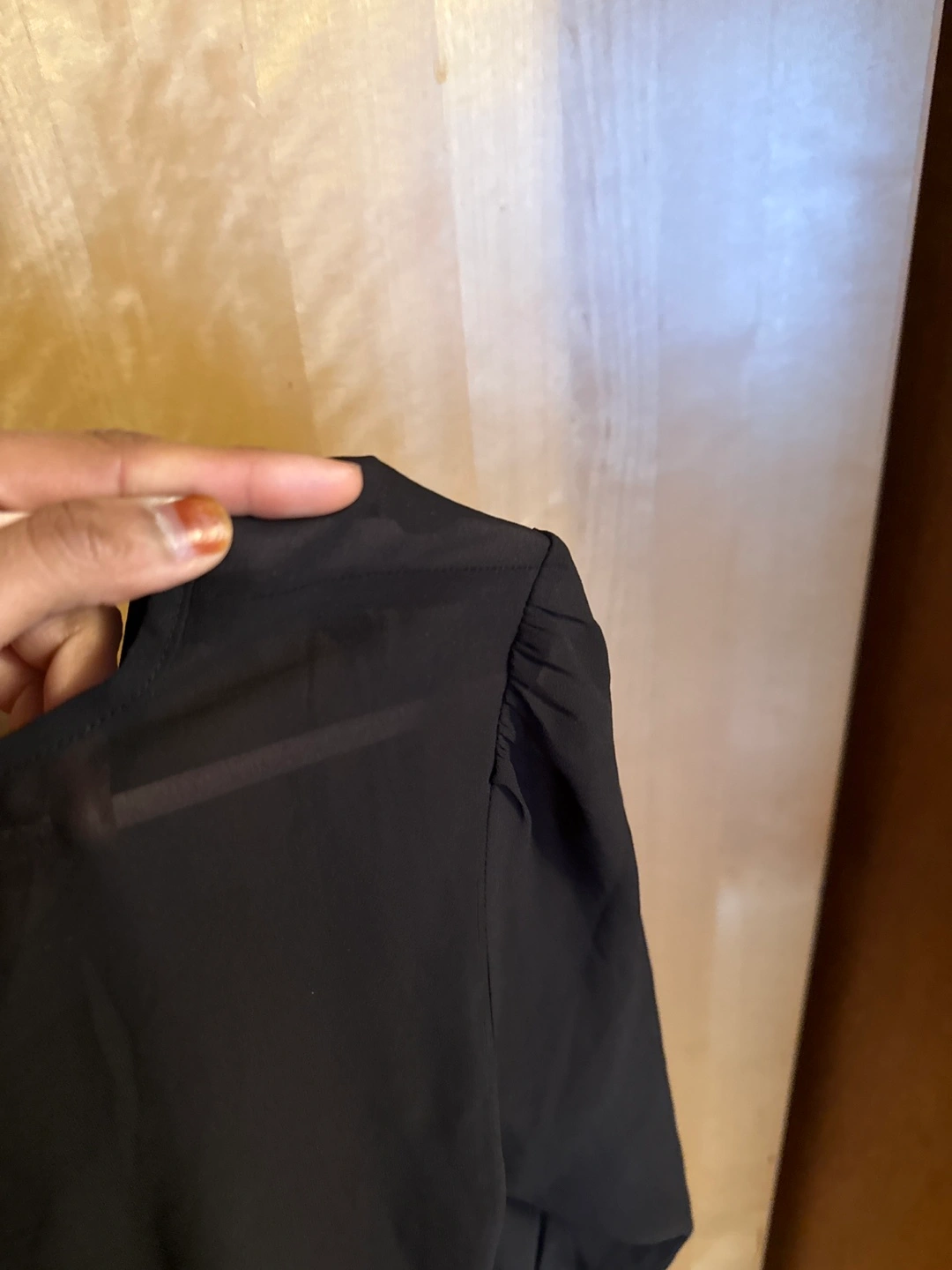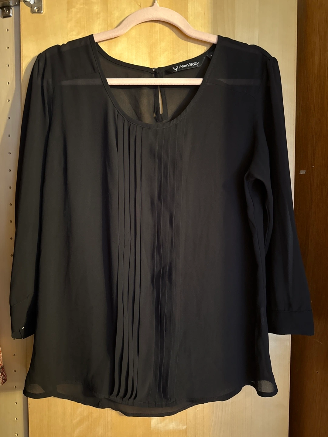 Black sheer blouse. Size large. Three-quarter sleeves. Pleated detail at the front. Lightweight fabric. Elegant style.