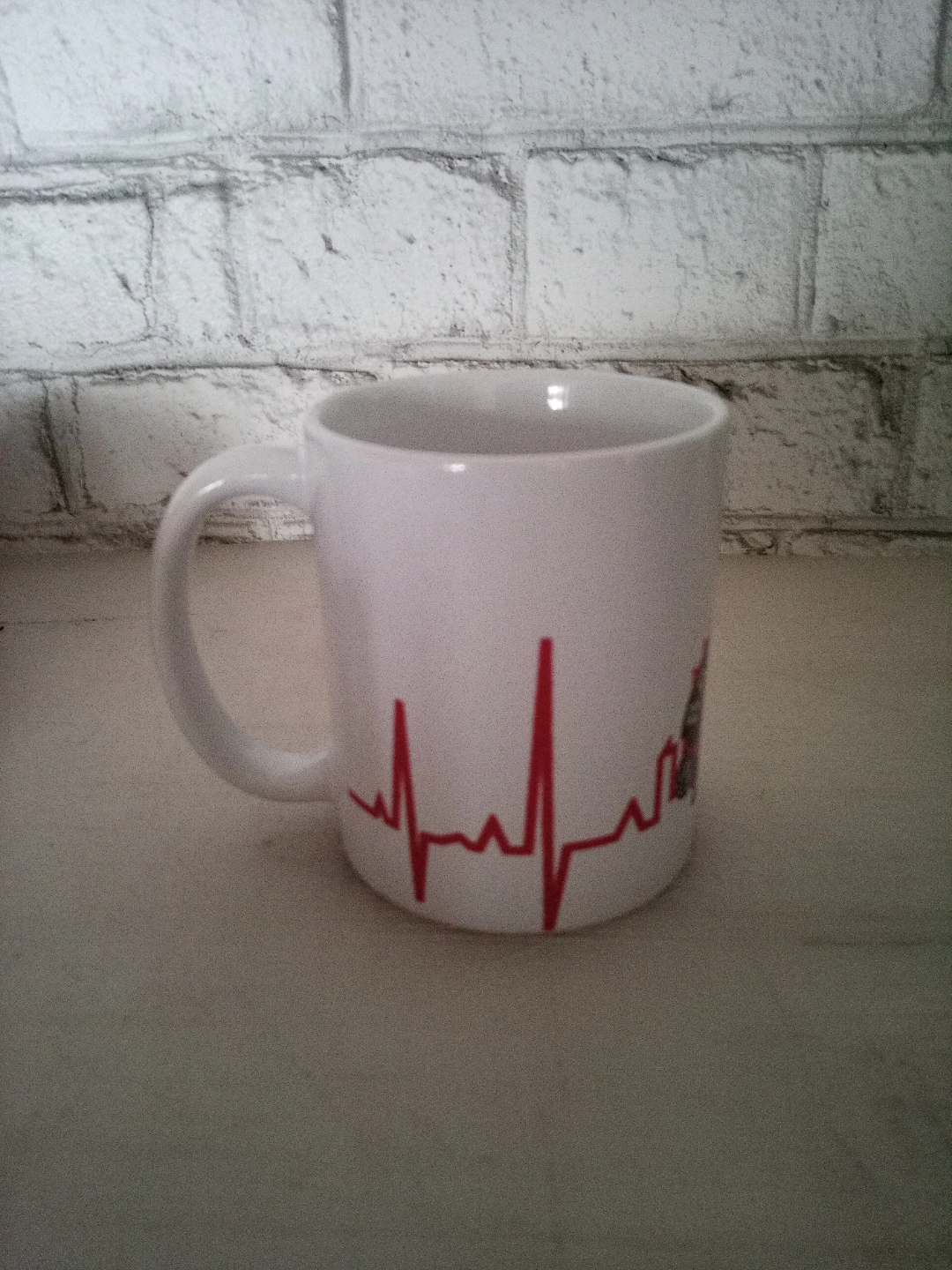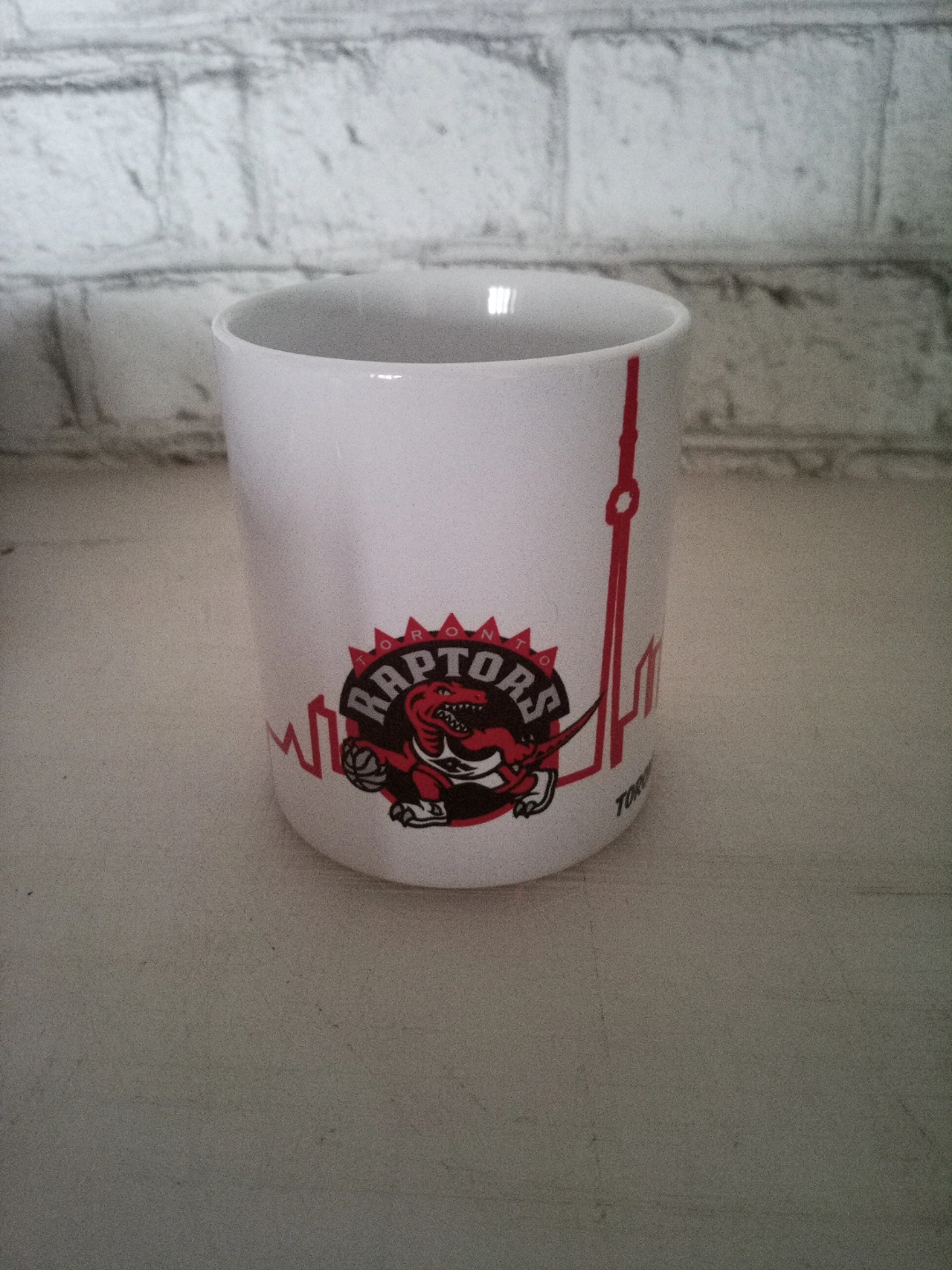 155White ceramic mug. Features Toronto skyline, Raptors logo, and heartbeat graphic. Great for coffee or tea. Unique souvenir.