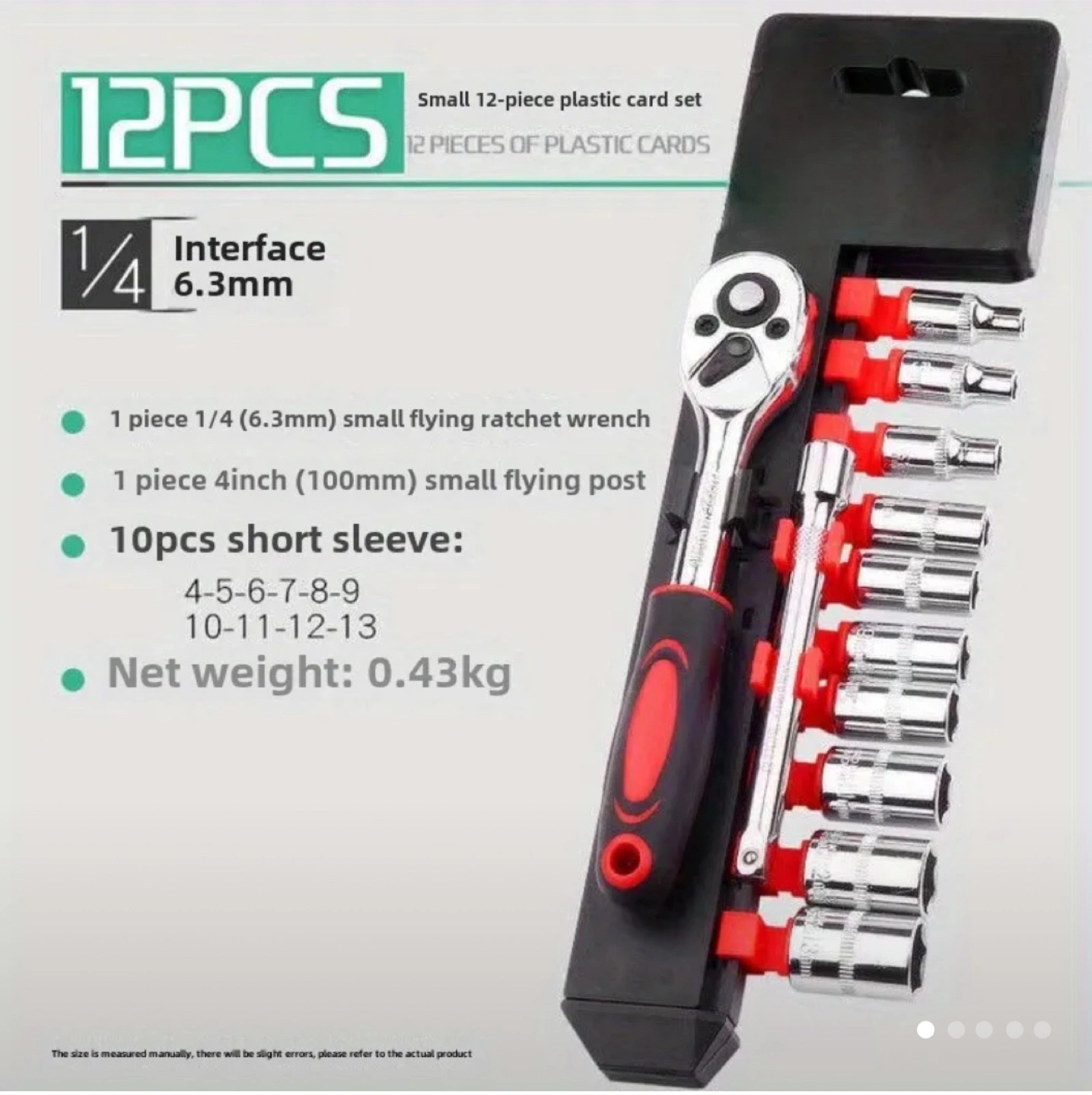 Chrome vanadium steel construction. Includes ratchet wrench, extension rod, and 10 sockets. Sizes 4-13mm. Quick storage. Efficient work. Net weight 0.43kg.