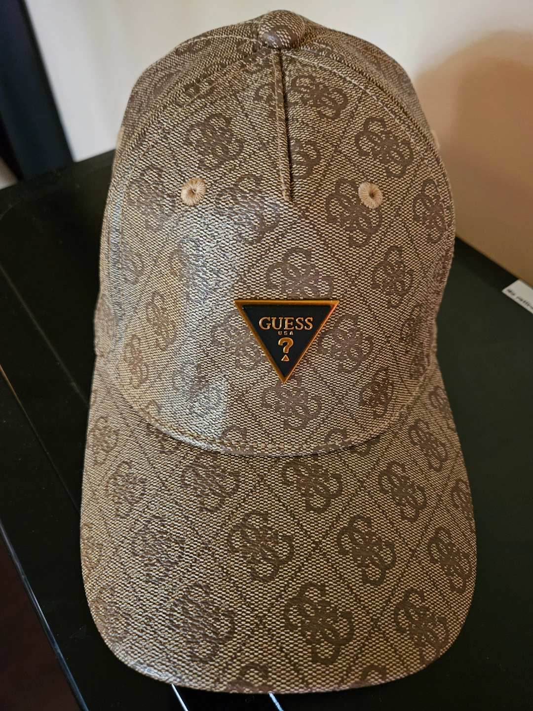 Brown and beige Guess baseball cap. Features Guess logo throughout and on a small triangular patch. Adjustable strap.I bought it and realized after that it just wasn't the right shape for my Head .This Hats Material is more on the stiff side rather then soft material and that's the reason it don't look right on my Head ,so it's for sale now and never ever been worn :)