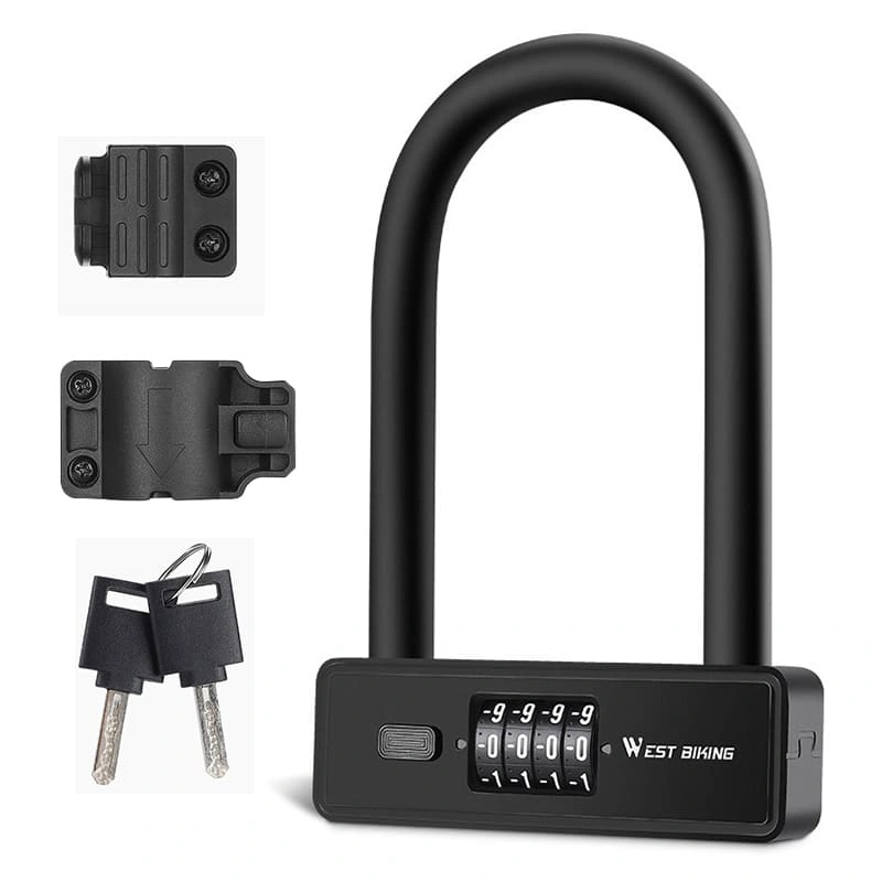 234Black U-lock for bikes. Includes two mounting brackets and two keys. Combination lock included. Durable steel construction.