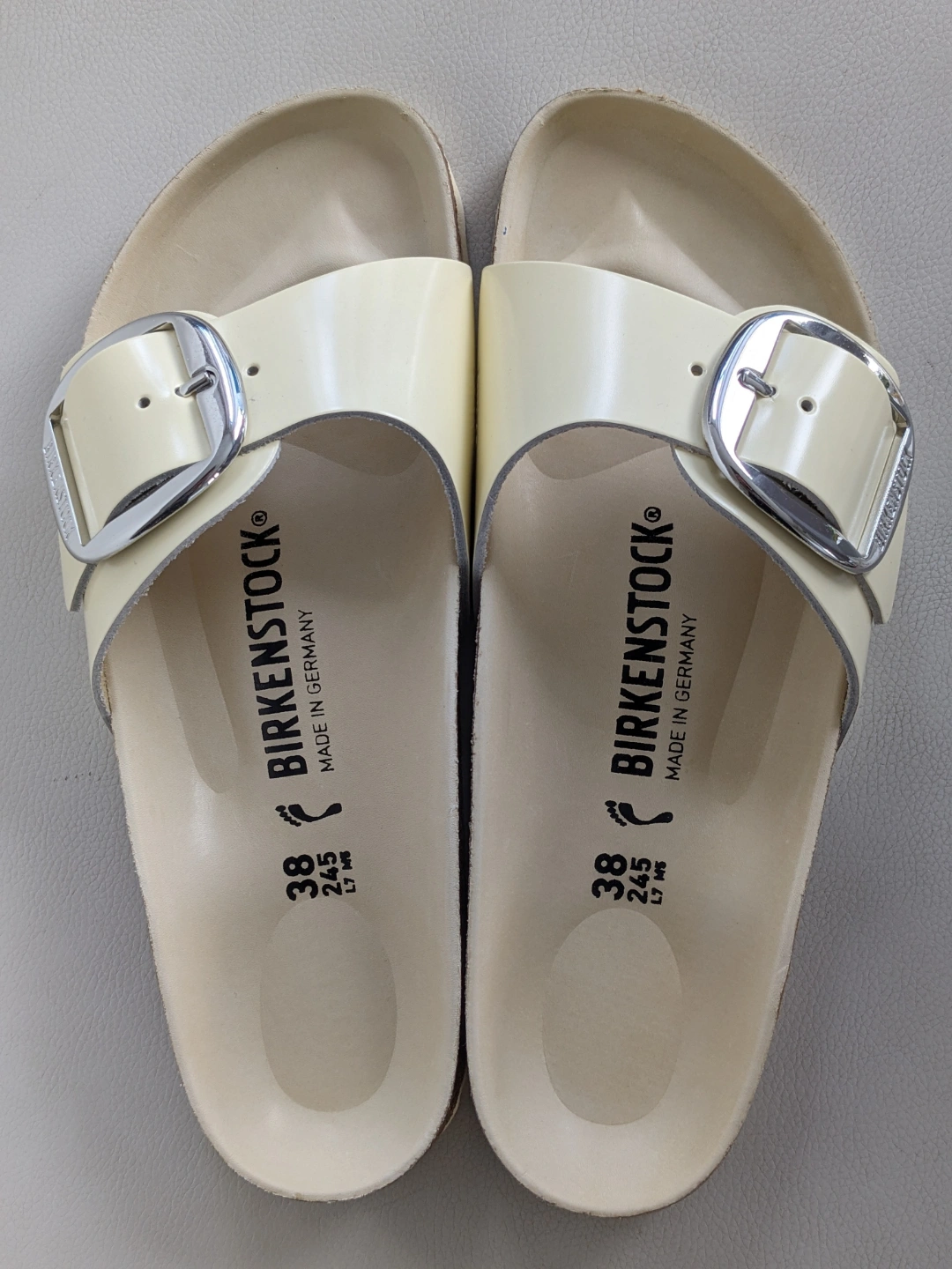 - Contoured cork-latex footbed creates custom support with wear - Natural leather upper with high-shine finish - Footbed lined in smooth leather for a luxe touch - Flexible EVA sole - Adjustable strap with oversized metal pin buckle - Made in Germany Colour: High Shine Butter
