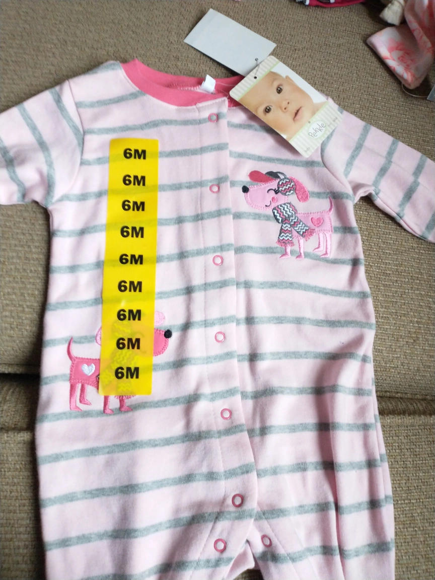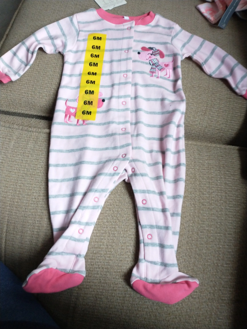 Size 6 months. Pink and grey striped sleeper with a dog applique. Long sleeves and snaps at the bottom. New with tags.