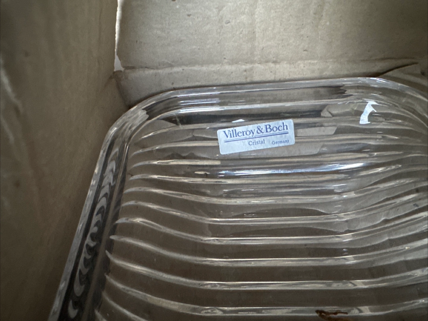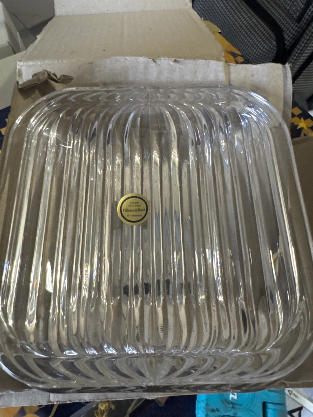 121Clear glass dish. Ribbed design. Square shape. Made in Germany.