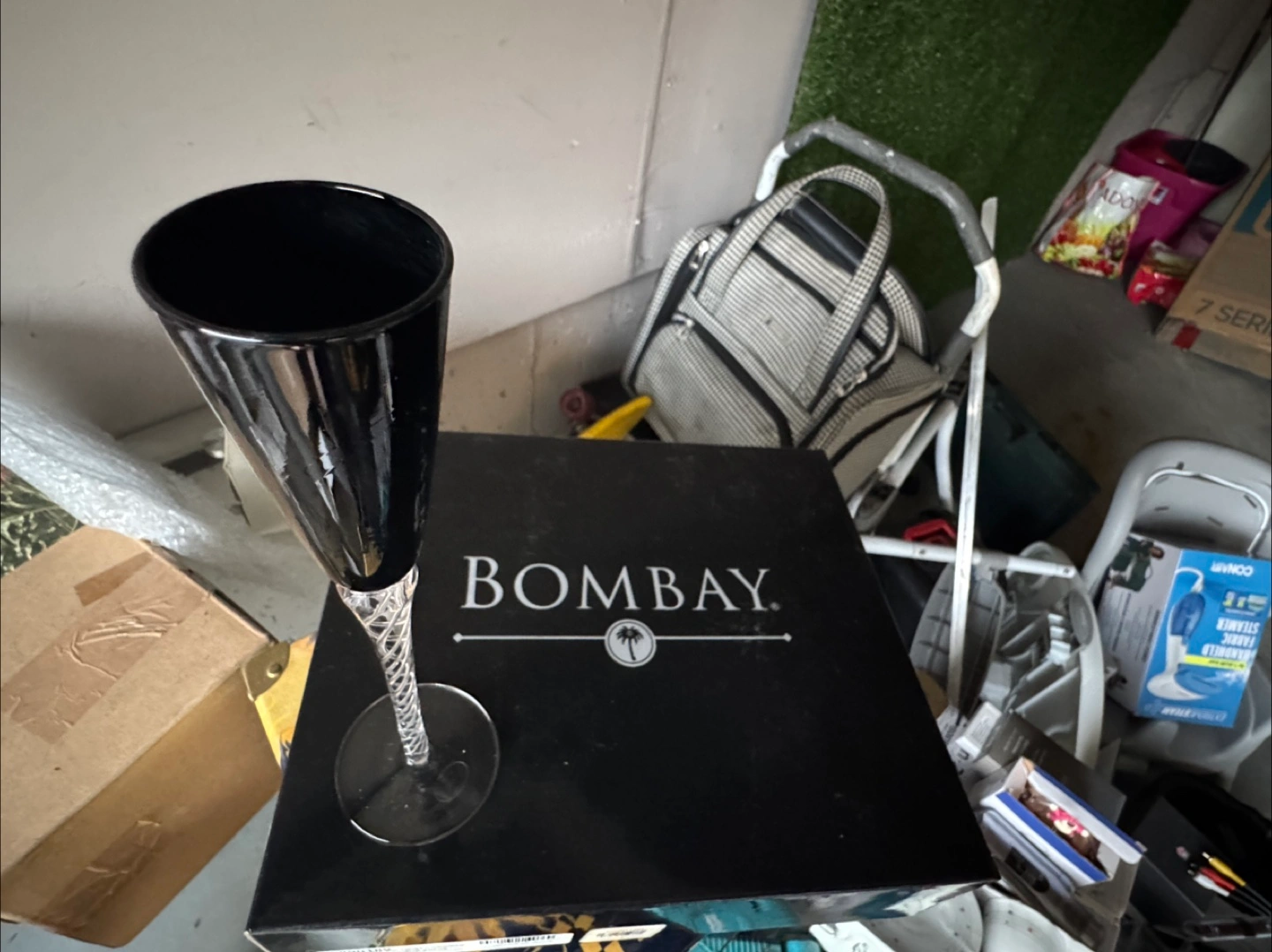 121Elegant black champagne flute. Clear twisted stem. Part of a set. In original box.