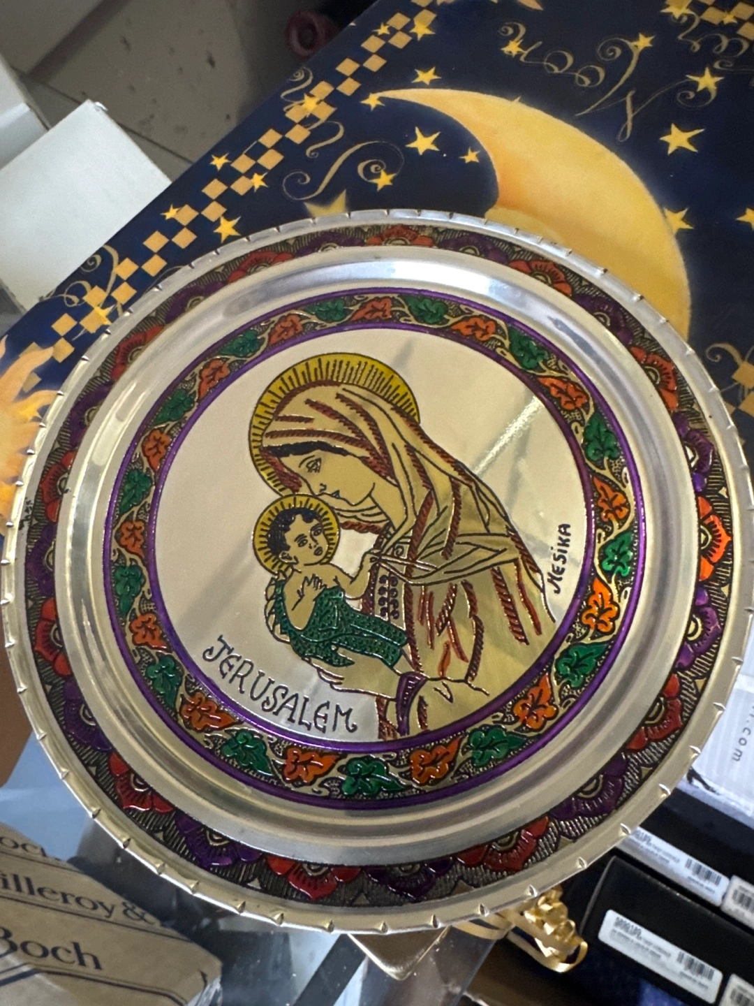 121Decorative metal plate. Features a colourful image of Mary and baby Jesus. Jerusalem is written on the plate. Intricate detailing around the image. Unique keepsake.